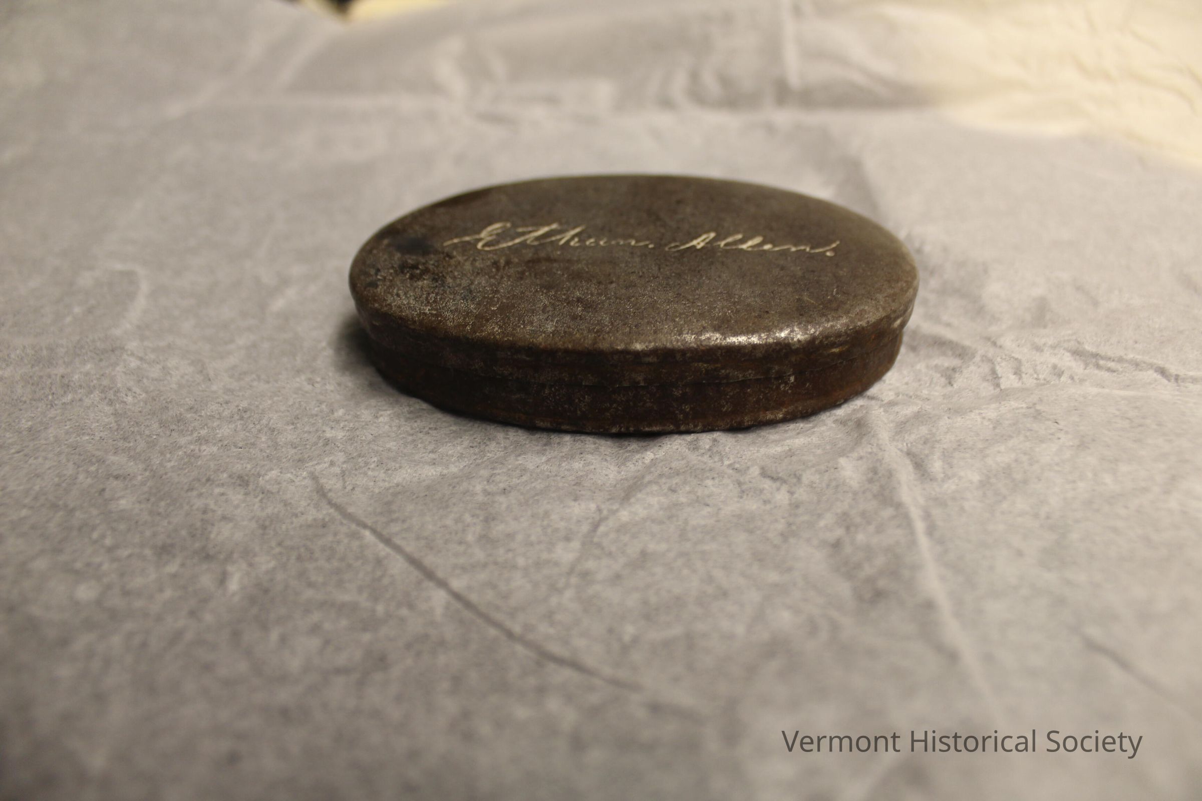 Small oval snuff box engraved with the inscription, "Ethan Allen", in script. The box is made tin is greyed with age. The lid fits over the base and completely removes when opened.