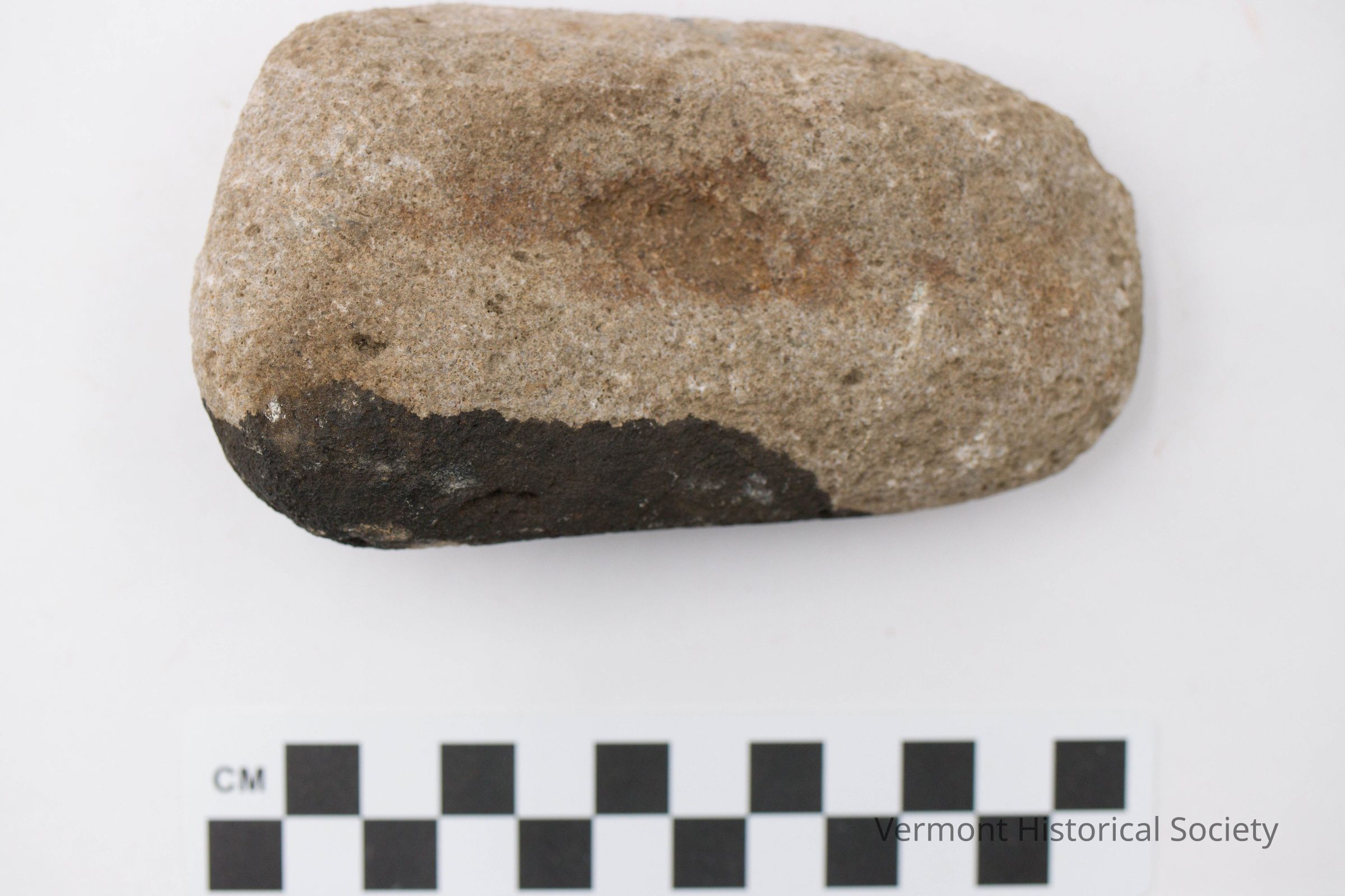 Abrading stone with a smooth, long groove in one face, and a smooth, indented groove on the other face. It is stained with a black, tar-like substance.Ethnography