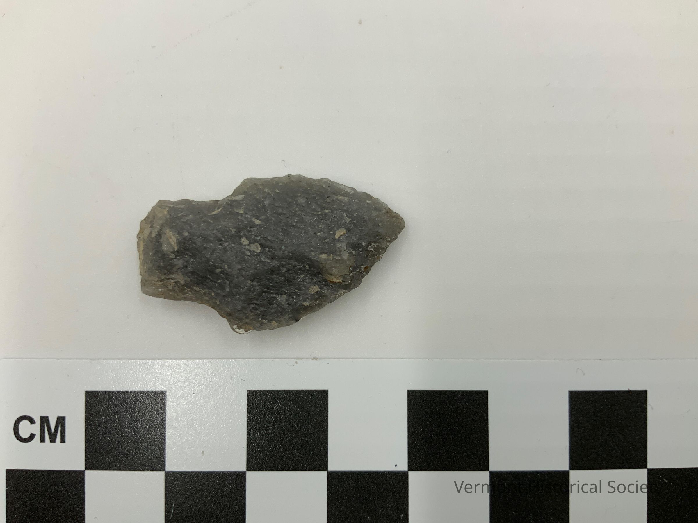Asymmetrical gray chipped stone projectile point with a straight stem. The blade edges curve outward.