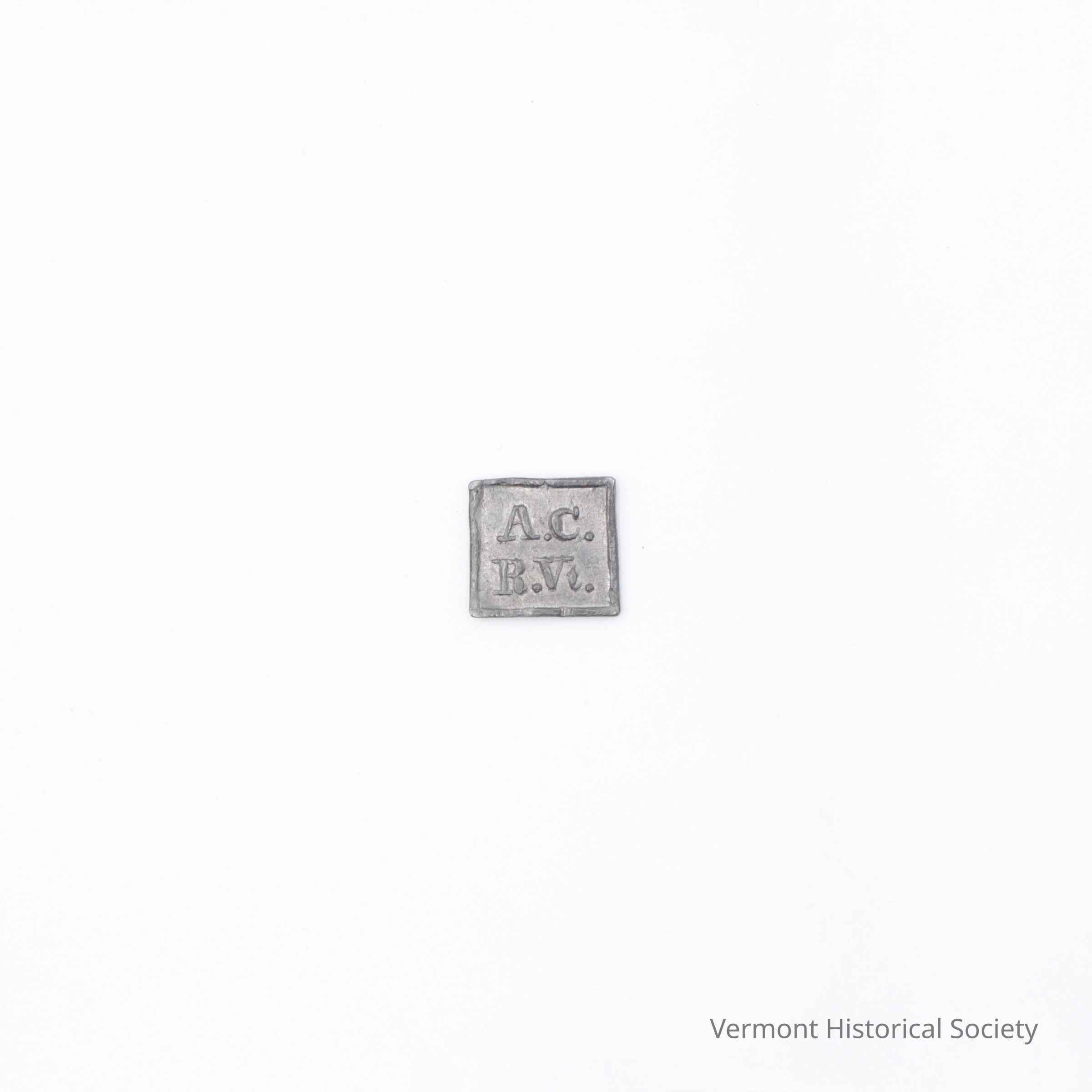 Small, square metal token. The front of the token is case with the initials, "A.C. R.Vt." and a raised border. The reverse is plain.