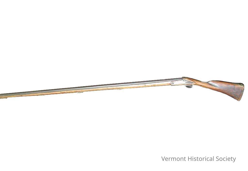 Long-barreled rifle with the name "ALLEN" crudely engraved into the barrel and the name "Ethan" decoratively engraved into the butt-plate. Several restoration parts of the rifle are cataloged but not affixed to rifle.