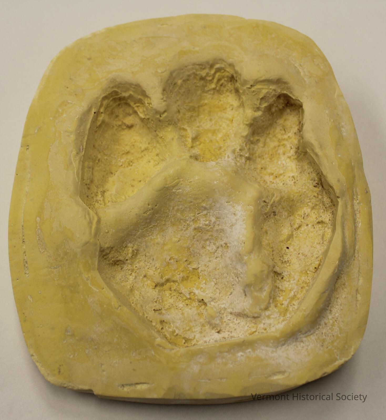 Duplicate of plaster cast made from footprints at Grafton Gulf, December 1934, by Rev. William J. Ballou. The original is held in the Bennington Museum.