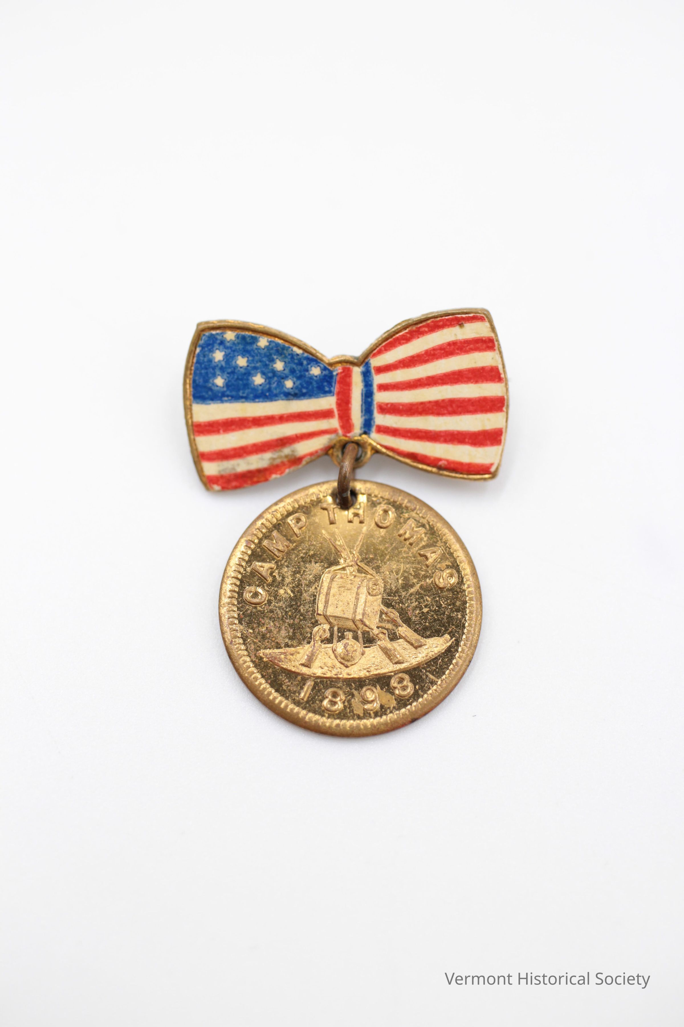 Commemorative pin consisting of a bow shaped pin bar and a round medallion. The bow has a sticker on the front that is printed to look like the United States flag. The front of the medallion shows an image of three bayoneted guns leaning against each other with a case and a canteen hanging from them and the inscription, "CAMP THOMAS 1898". The back of the medallion shows a soldier standing near two pup tents and the inscription, "CHICKAMAUGA PARK 1898".Context