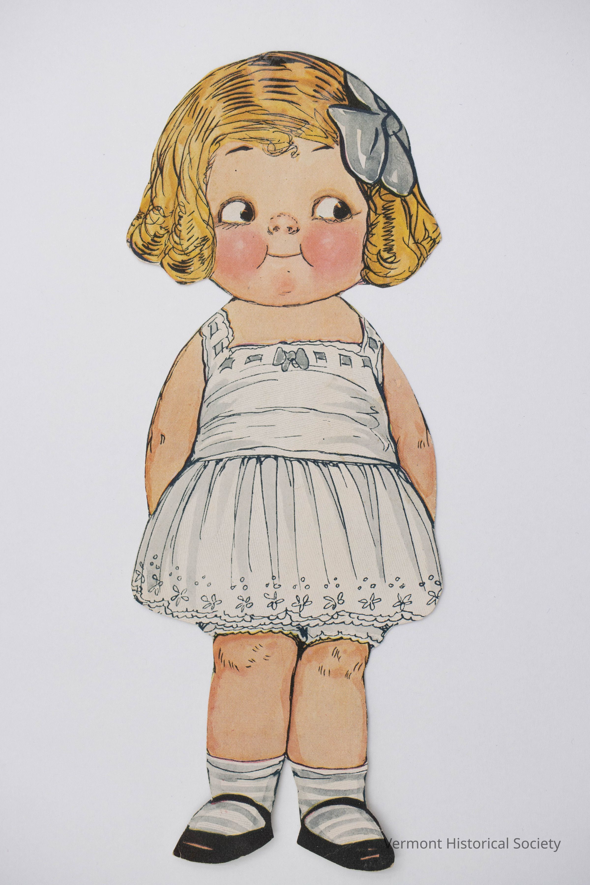 Small paper doll. The doll depicts a young child with yellow hair and pink skin wearing a white dress undergarment, blue-and-white socks, and black shoes. The back shows a portion of a magazine page and the handwritten label, "Florence Souther".Context