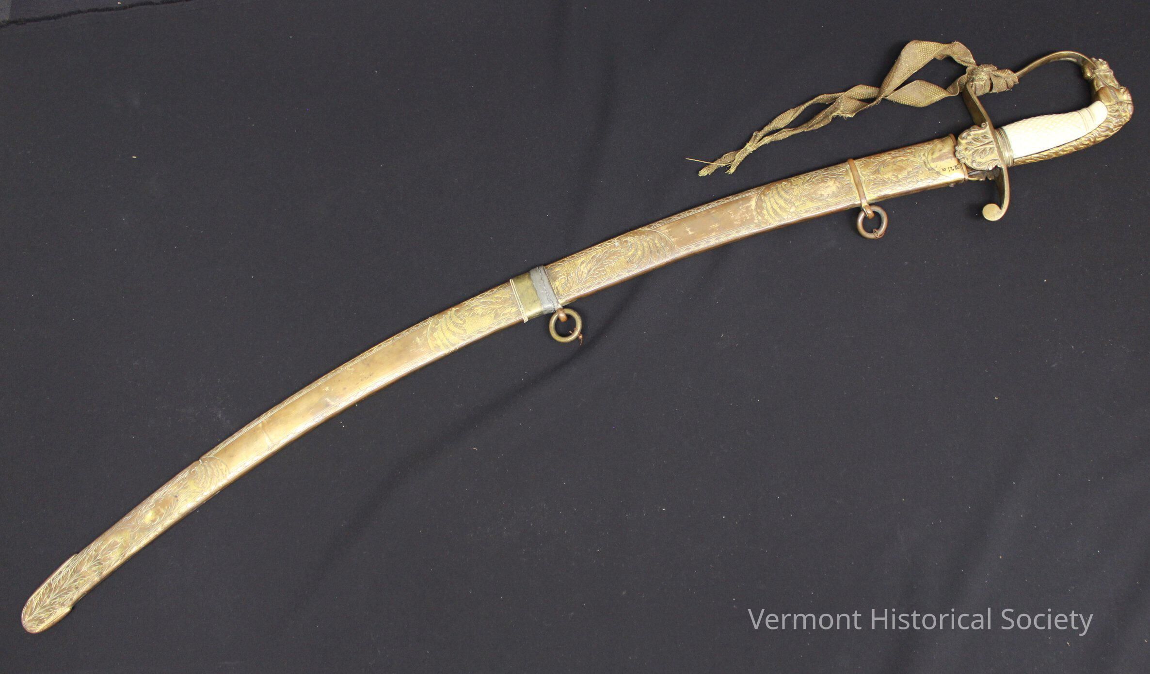 Saber with decorative engrave scabbard. The handle of the sword is made of ivory carved into a repeating diamond pattern. The pommel is in the shape of a horse's head with the knuckle guard coming out of its mouth. A gold ribbon is tied to the knuckle guard. The rain guard has a small applied shield at the center. The blade is blue metal with the engraved decorations inset with gold.Context