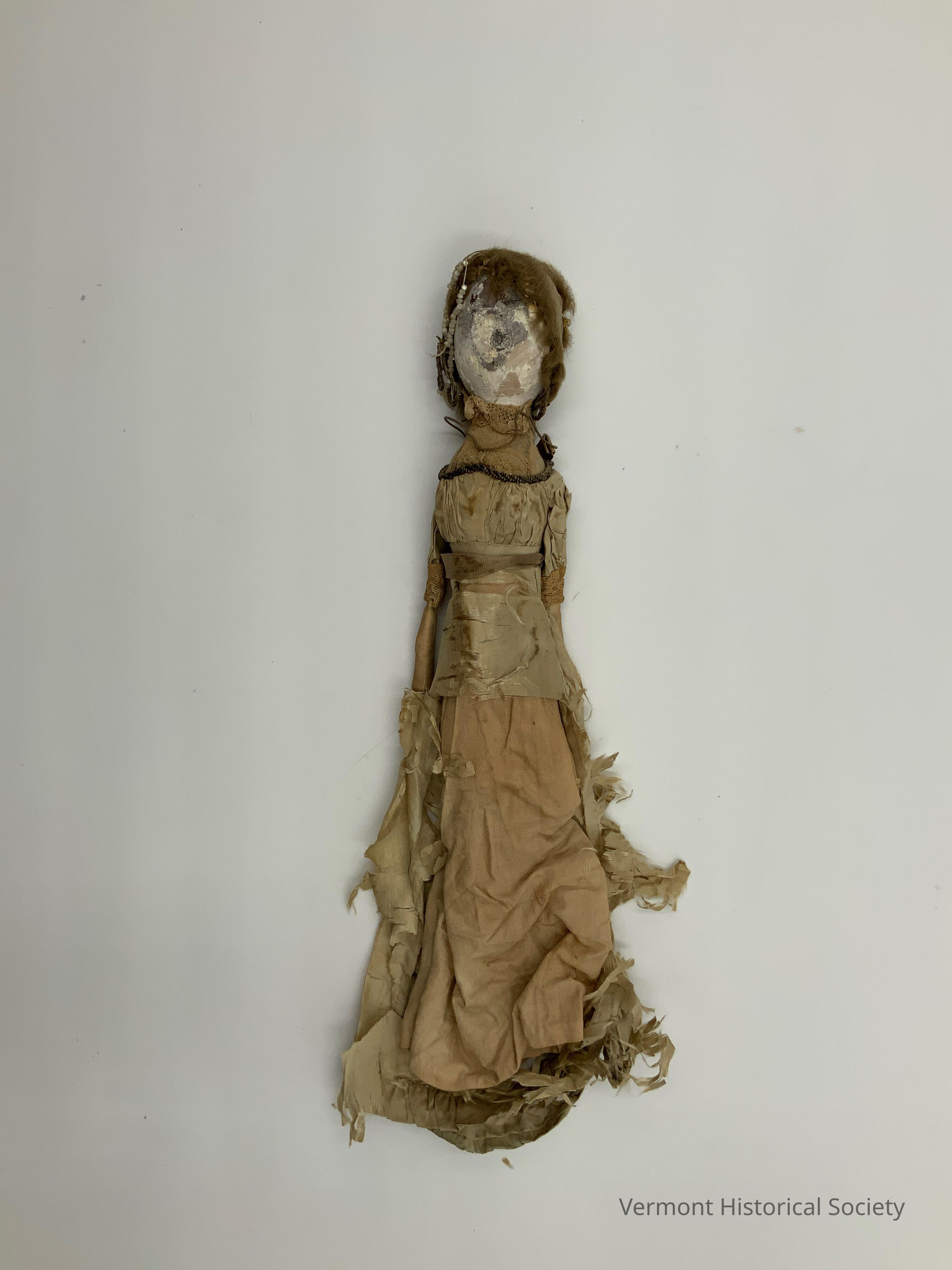 Doll with a wooden head and soft body, arms and legs. The head has attached wool hair and remnants of plaster. (The plastered face is now separated from the head.) There is a string of glass beads attached to the head. The doll is wearing a silk satin dress lined in fine linen with a lace chemisette. The dress has a high waistline, a gathered bodice, and elbow-length sleeves. The neckline of the dress is edged with gold braid. The skirt of the dress is shredded. The doll's arms are made of linen doubled over and rolled into a tube. Any former plaster forearms and hands are no longer present.Context