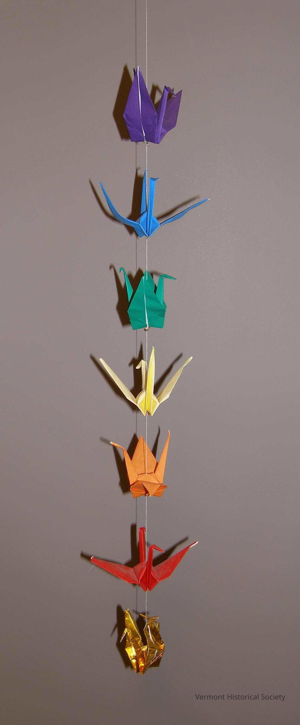 7 origami cranes attached to a white string. Each is folded from a different color paper; from the top they are purple, blue, green, yellow, orange, red, and shiny gold. There is a loop of jute twine at the top.
