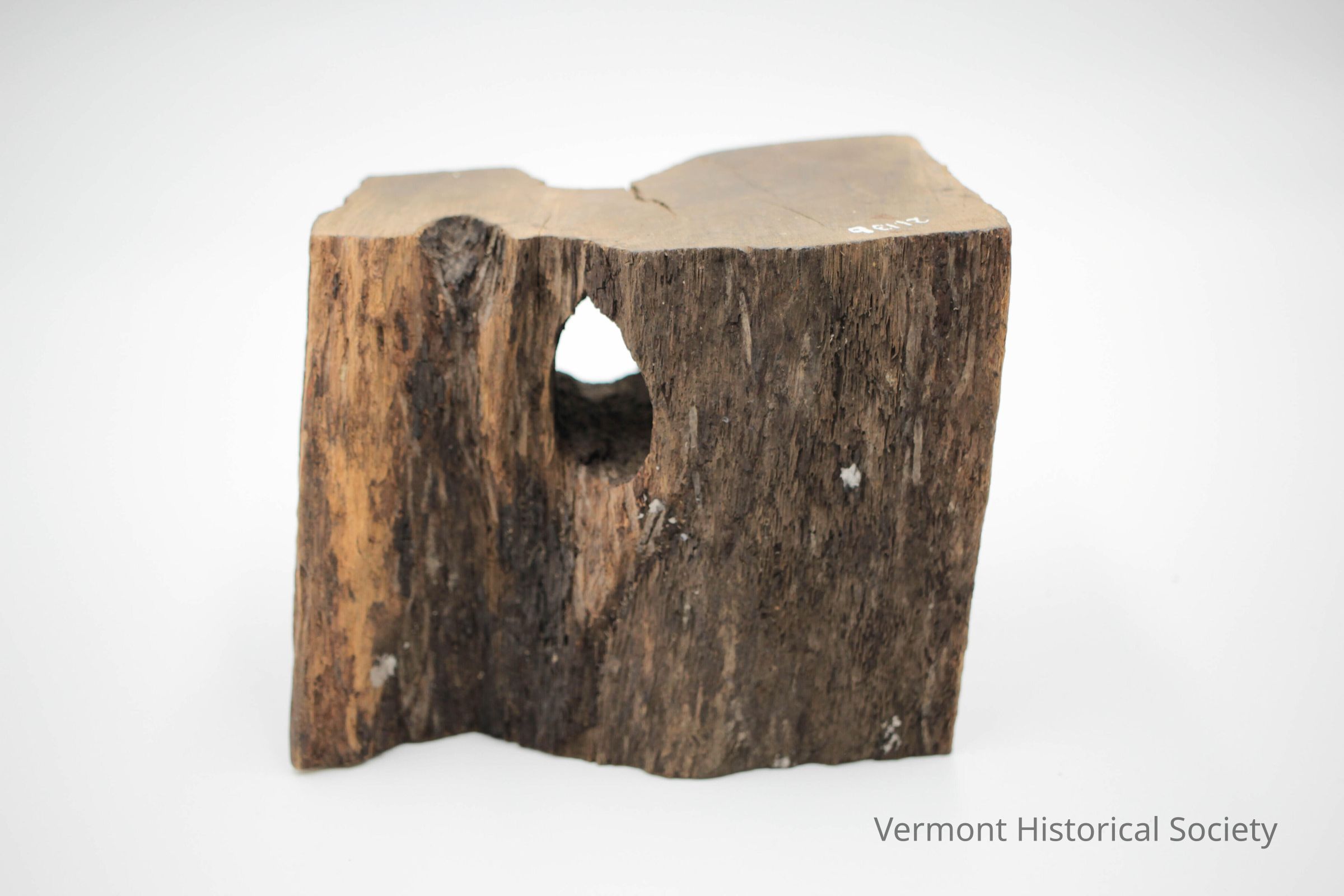 Two irregularly shaped pieces of wood. The large piece resembles a tree stump with a whole across the middle. The small piece is flat on two opposite sides, and carved into a curve on other sides.