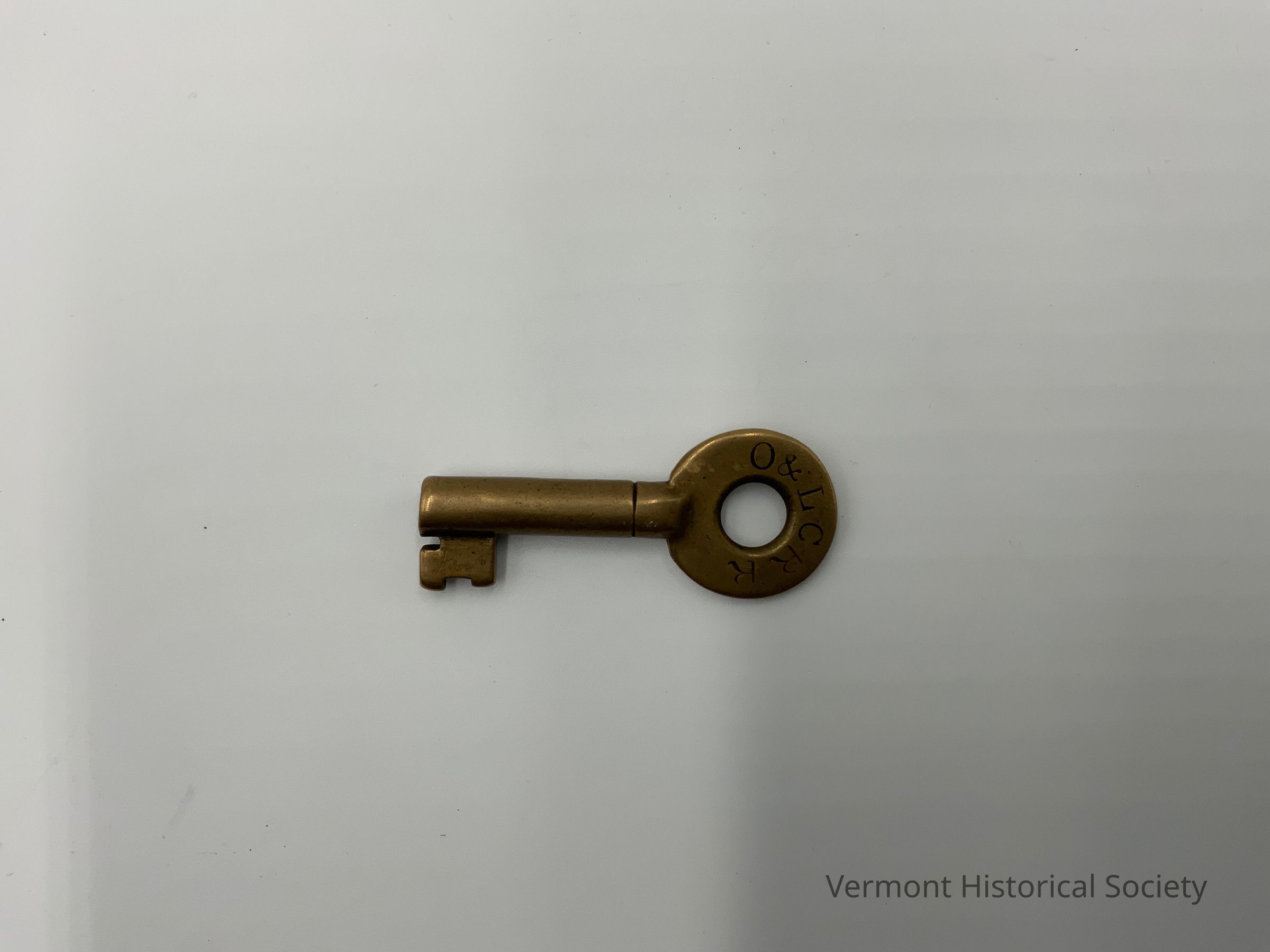 Key with round head. The head is labeled "O & L C R R" on one side. The side opposite the head has a small portion that sticks outward with two prongs.