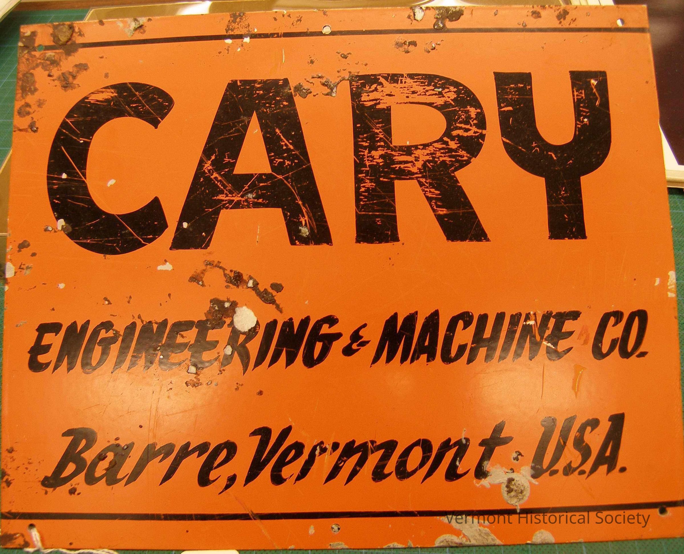 Square, orange metal sign painted in black with the words, "CARY ENGINEERING & MACHINE CO. Barre, Vermont, U.S.A."