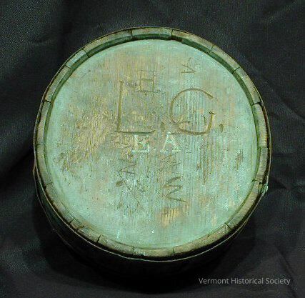 Round wooden canteen with metal bands around it. The side is engraved with several letters, the neatest being "E.A" in the center. The letters "L.G." are engraved larger toward the top, and the letter W is engraved in several places with different orientations.