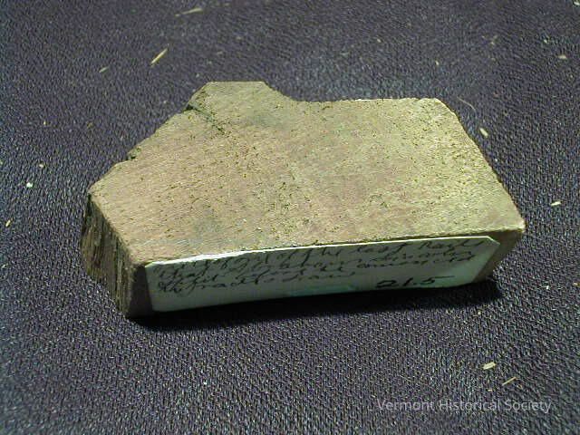 Wood fragment from a flat board. The wide side of the piece is shaped like a 1. One narrow side is pasted with a paper label that reads, "[illeg] of one of the last rails that Abraham Lincoln split before he commenced to practice law." [edited for spelling]Context