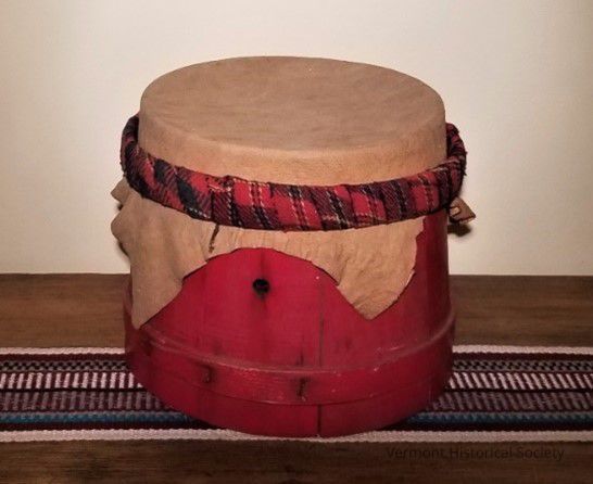 Small drum made from wooden staves and banded with wooden hoops and metal staples. Probably an adapted firkin. Skin drumhead is stretched over the top. Red and black flannel, decorative band (probably added later). Interior of the drum is sealed with asphalt.Context