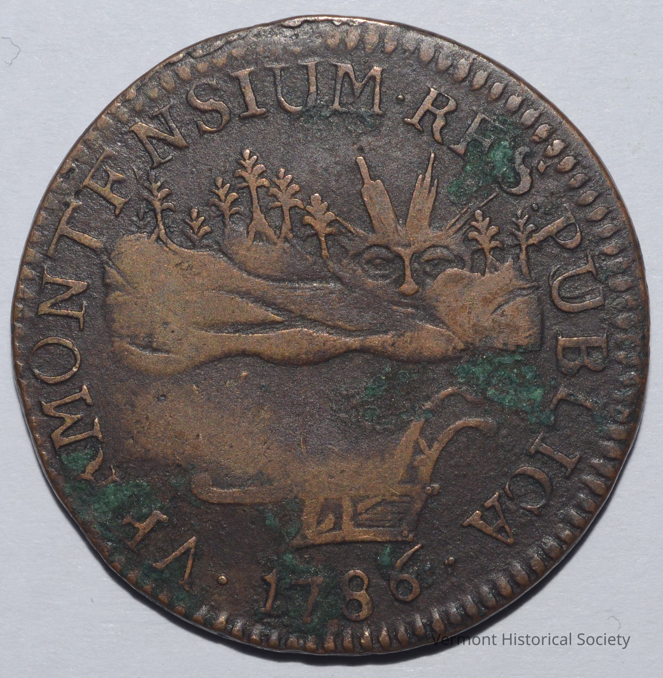 Copper coin with a radiating eye on one side and a pictorial scene on the other. The eye side shows a detailed human eye with 13 rays emitting from it in every direction. Between each ray is a 6-petaled flower (13 in total). The words, "STELLA QUARTA DECIMA" ring the edge. The reverse shows a scene of a plow in a field with a line of hills and trees on the horizon. A sun with two eyes and a prominent nose peeks over the horizon. The words "VERMONTENSIUM RES PUBLICA" ring the edge.