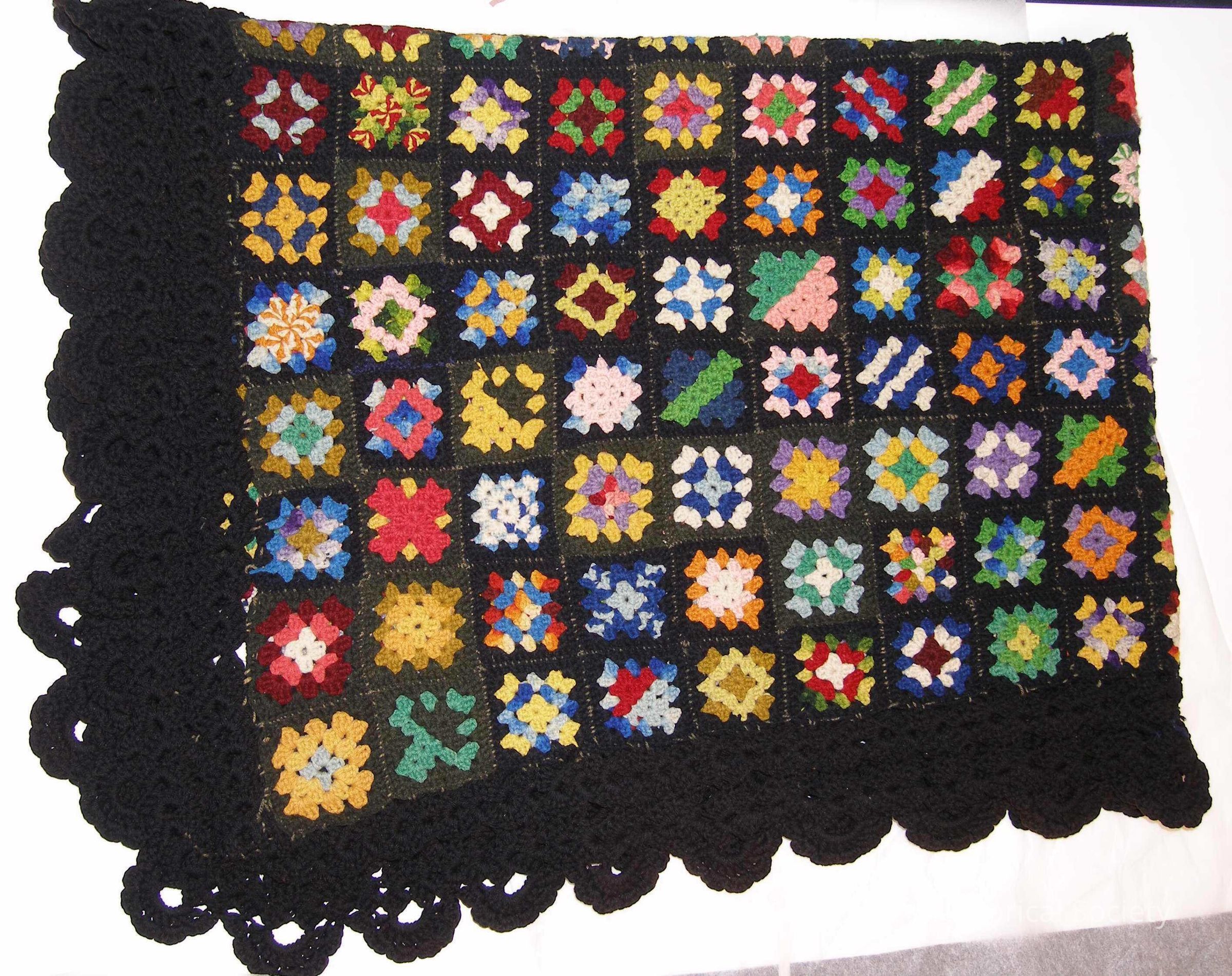 Crocheted afghan consisting of 266 multicolored squares with a black border.