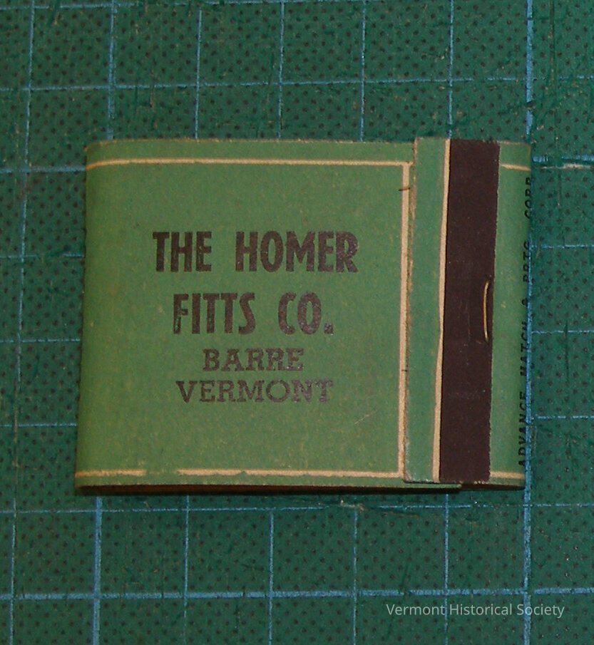 Small green matchbook. The matchbook is inscribed, "THE HOMER FITTS CO. / BARRE / VERMONT"in black on the front flap and "Dry Goods / Ladies' Apparel / Accessories" on the back and on the inside flap. There are red-headed matches inside, and a striking strip on the lower front flap.Context