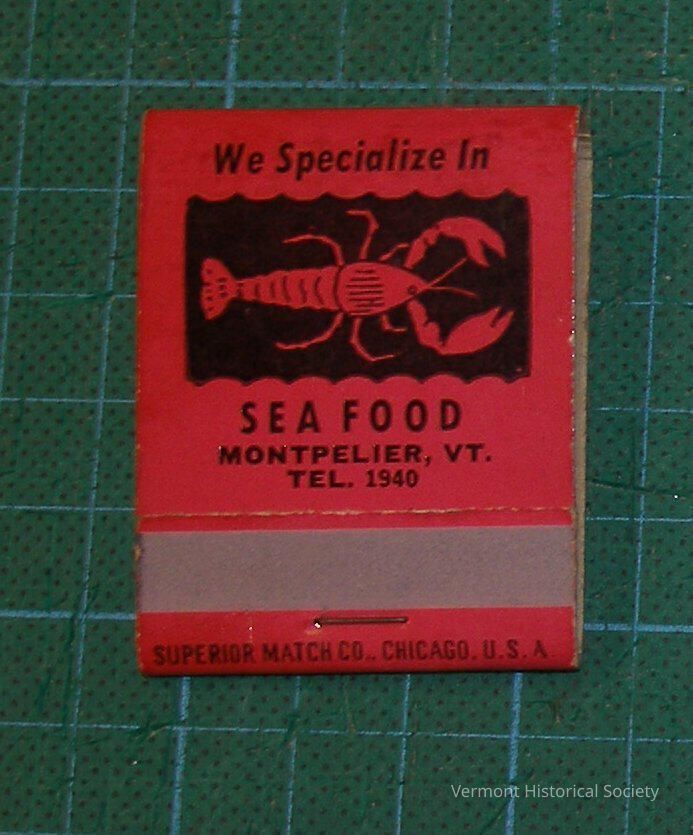 Red and black matchbook printed with the black inscription, "We Specialize In/ SEA FOOD/ Montpelier, VT./ Tel. 1940" with sketch of lobster in center. Printed on back, "Call Again" with sketch of a young woman using phone. Printed on top fold, "LOBSTER POT" and along bottom edge, "Superior Match Co., Chicago, U.S.A." On inside cover, in a food-themed border, "Two good places to Eat/ Here and/ at Home/ You are cordially invited to try us/ and be convinced". There are red-headed matches inside, and a striking strip on the lower front flap.Context