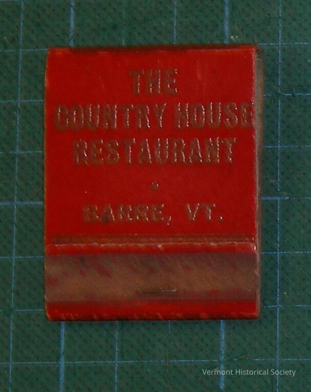Red matchbook with the inscription, "THE COUNTRY HOUSE RESTAURANT BARRE, VT." in gold across the front. The back is inscribed, "ITALIAN / AND / AMERICAN / DISHES Vic Guiduli / Prop." Printed on top fold is "Tel. 2160." There are red-headed matches inside, and a striking strip on the lower front flap.Context