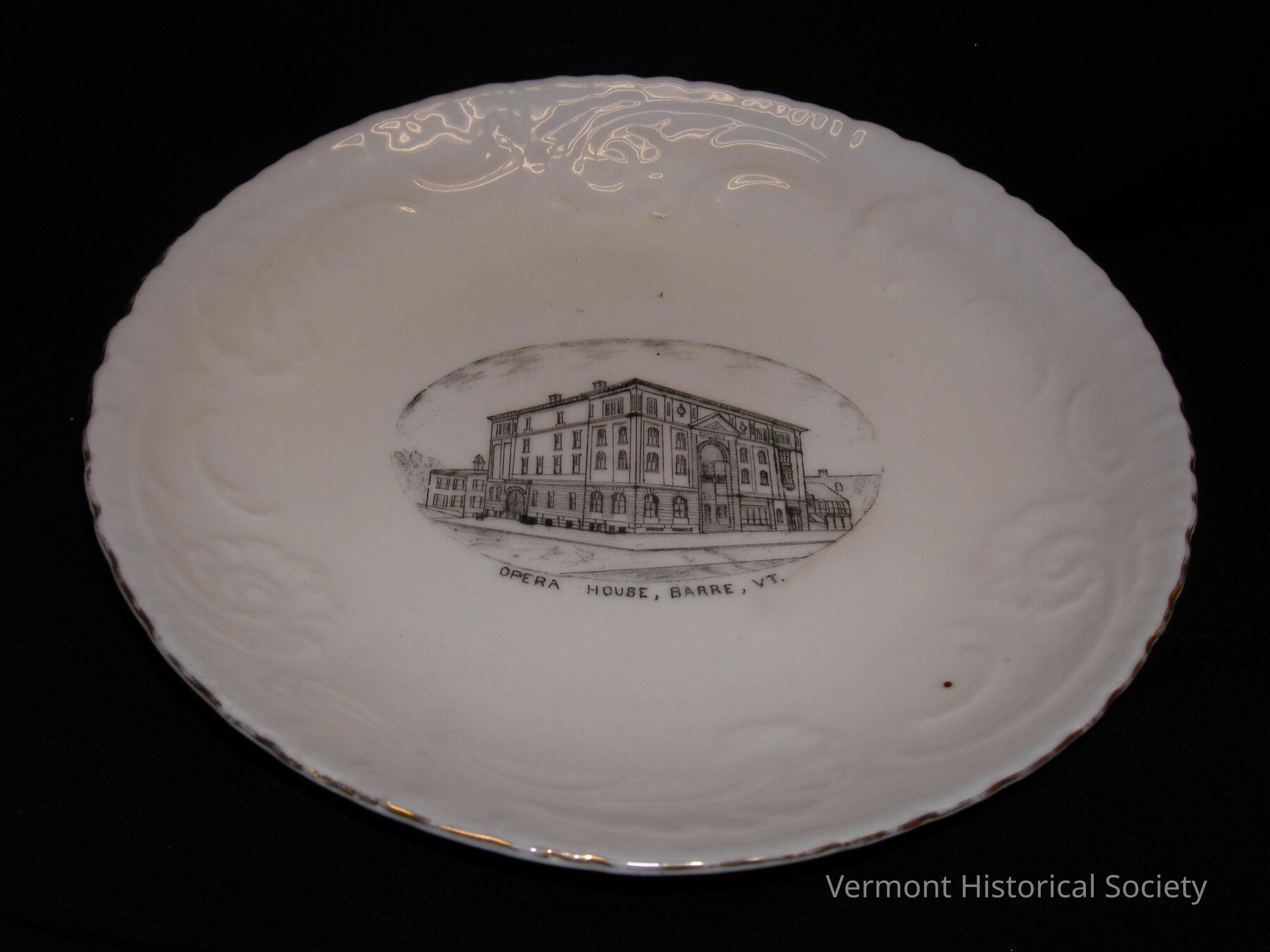 White porcelain saucer printed at the center with an engraved image of a large, square building on a city corner. The image is labeled, "OPERA HOUSE, BARRE, VT." The rim of the plate is molded with floral swirls, and the edge is gilded. The reverse is marked, "Made in Austria for C. N. Kenyon & Co., Boston Bargain Store Barre, Vt. Vienna.Context