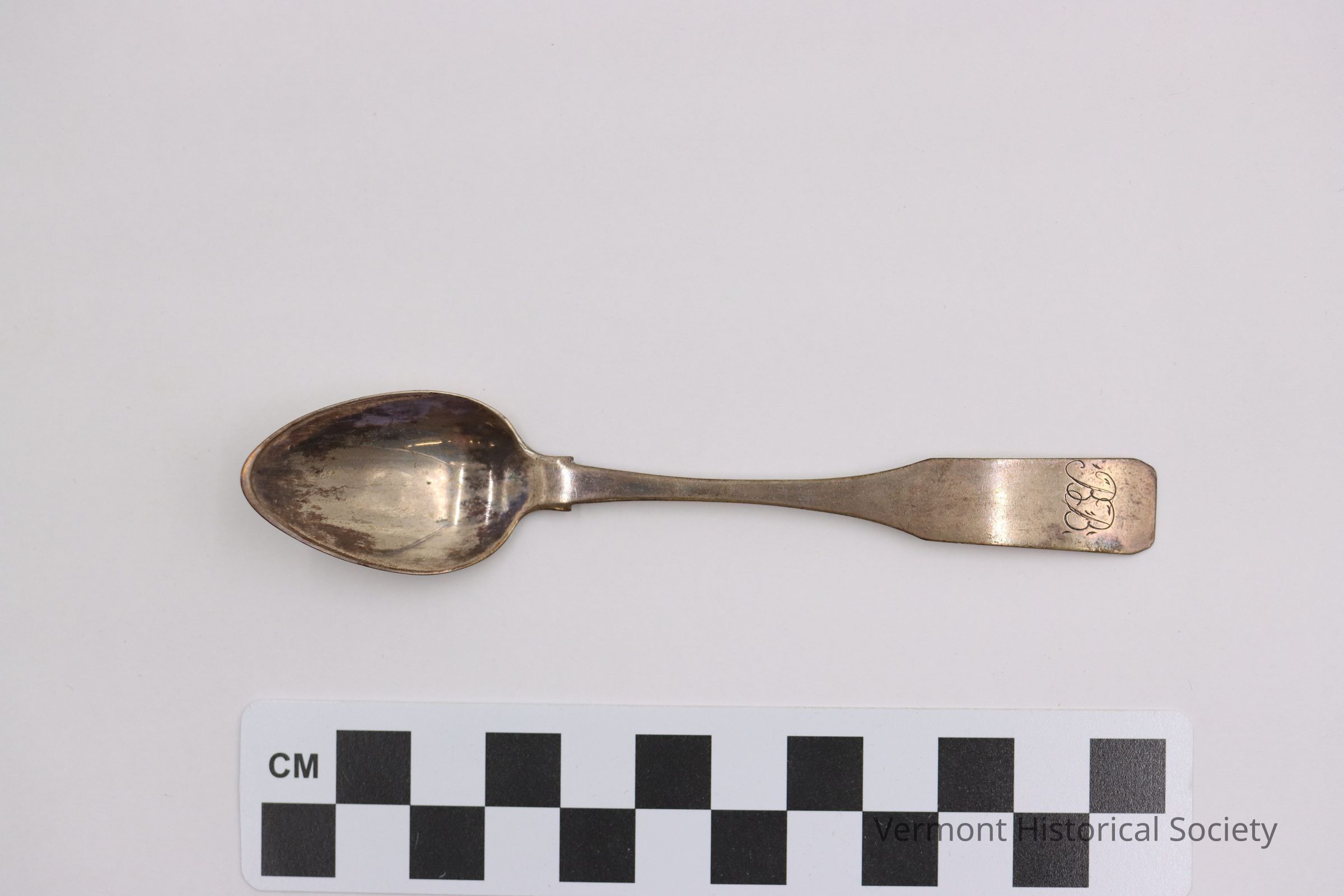 1 of 6 teaspoons engraved with the initials "BB". The back is stamped with the mark "TC" within a rectangle.