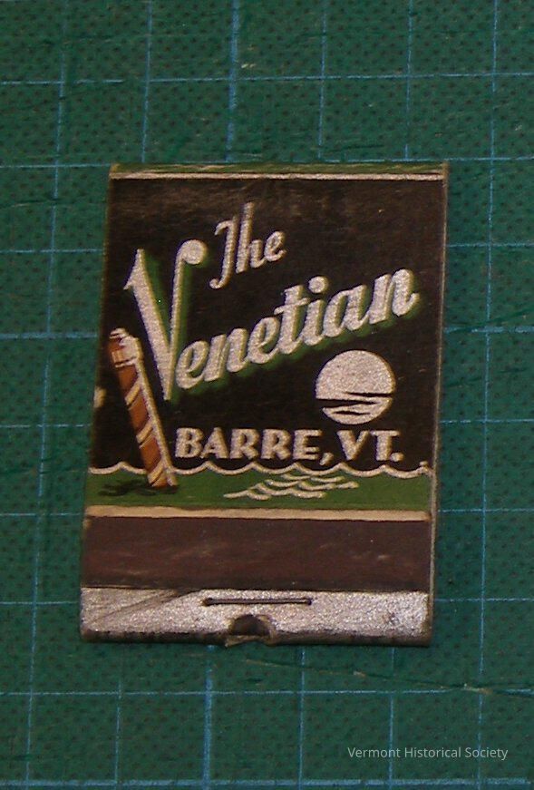 Black matchbook. The front of the matchbook is inscribed, “The / Venetian / BARRE, VT.” in silver with dark green shading. A silver printed moon sits between the text, and green choppy waves adorn the bottom with a red and white canal pole leaning diagonally to the left. The front flap tucks into the match’s striker, which has a silver colored band and staple above the crease. The back of the exterior shows an empty restaurant and bar, with a solid green band that has white print saying, “PHONE 933W.” The interior does not have any matches and has no added color, except for green lettering saying, “Reserve Our DEN.”Context
