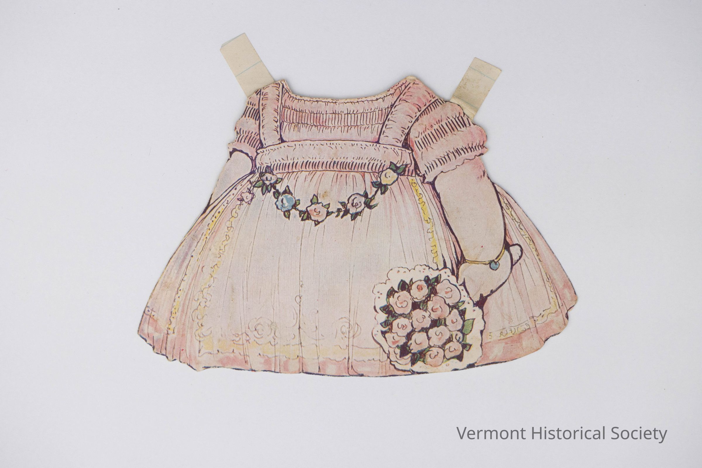 Printed paper dress for a paper doll. The dress is pink with an extremely wide skirt. It shows one pink arm holding a bouquet of pink flowers. The back shows a portion of a magazine article.Context