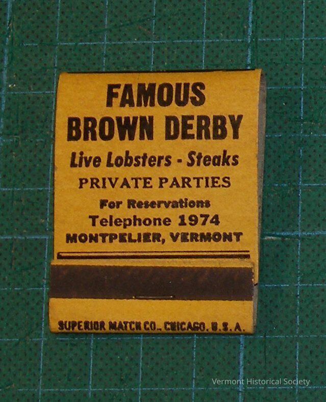 This matchbook is yellow with black lettering and has the words "FAMOUS BROWN DERBY Live Lobsters - Steaks Private Parties For Reservations Telephone 1974 Montpelier, Vermont" printed on its cover. On the back of the matchbook, there is an image of a black derby hat. On the top fold of the matchbook, the words "Dine Dance" can be seen. Along the bottom edge of the matchbook, the words "Superior Match Co., Chicago, U.S.A." are printed.Context