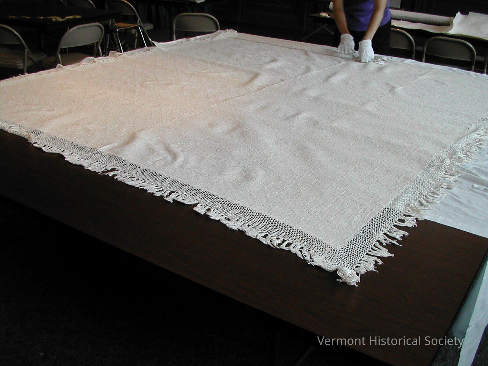 White overshot coverlet with applied fringe on three side. The coverlet consists of two woven panels seamed together down the center, with the weaving patterns not matched. The fringe was likely added at a later date.