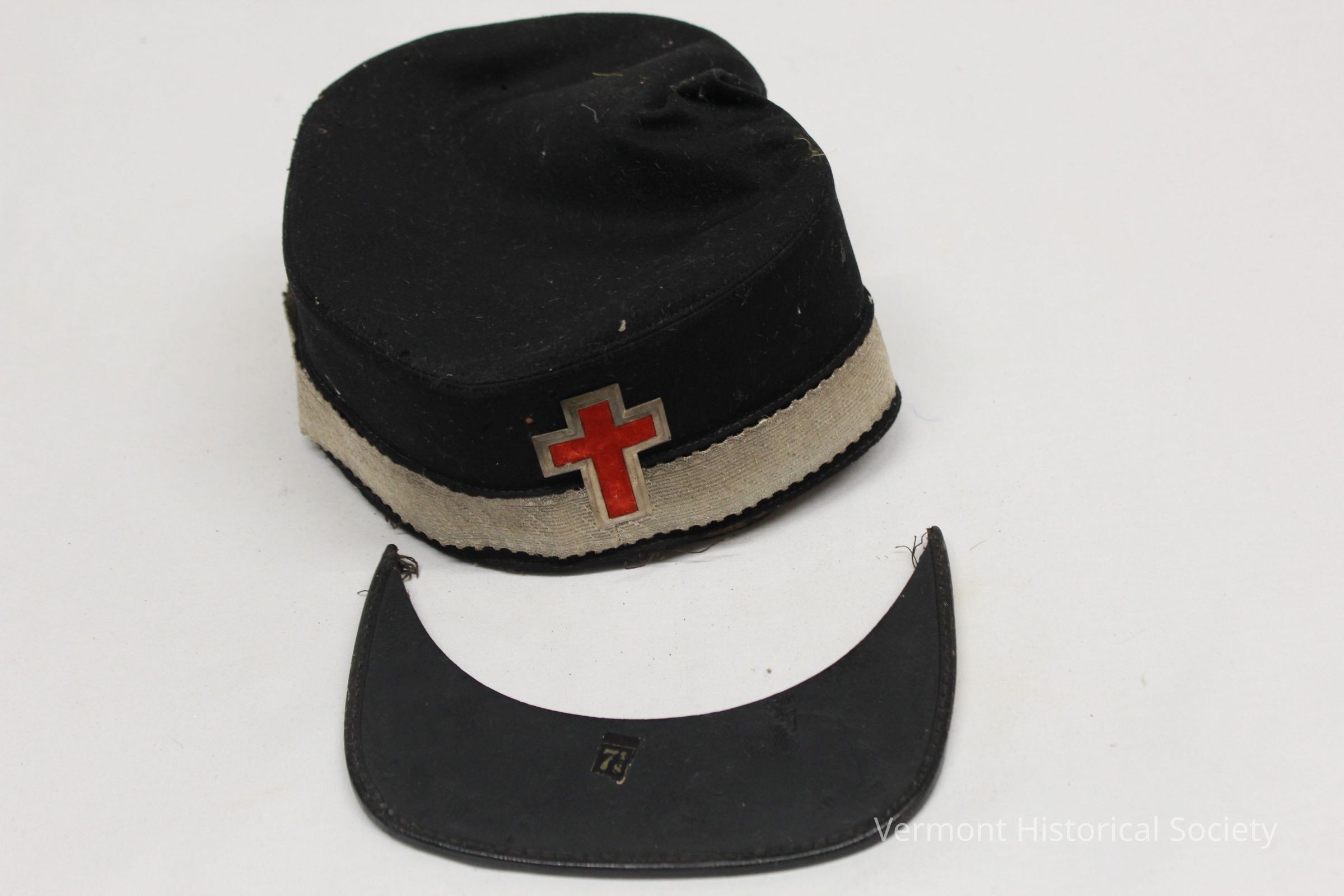 Black felted wool cap with a leather brim (detached). The crown is unstiffened. The base of the crown is decorated with a silver ribbon, and a red velvet cross is appliqued to the center front. The interior is lined with leather, and there is a label that reads, "J.R. Pettis & Co., Troy, N.Y."Context