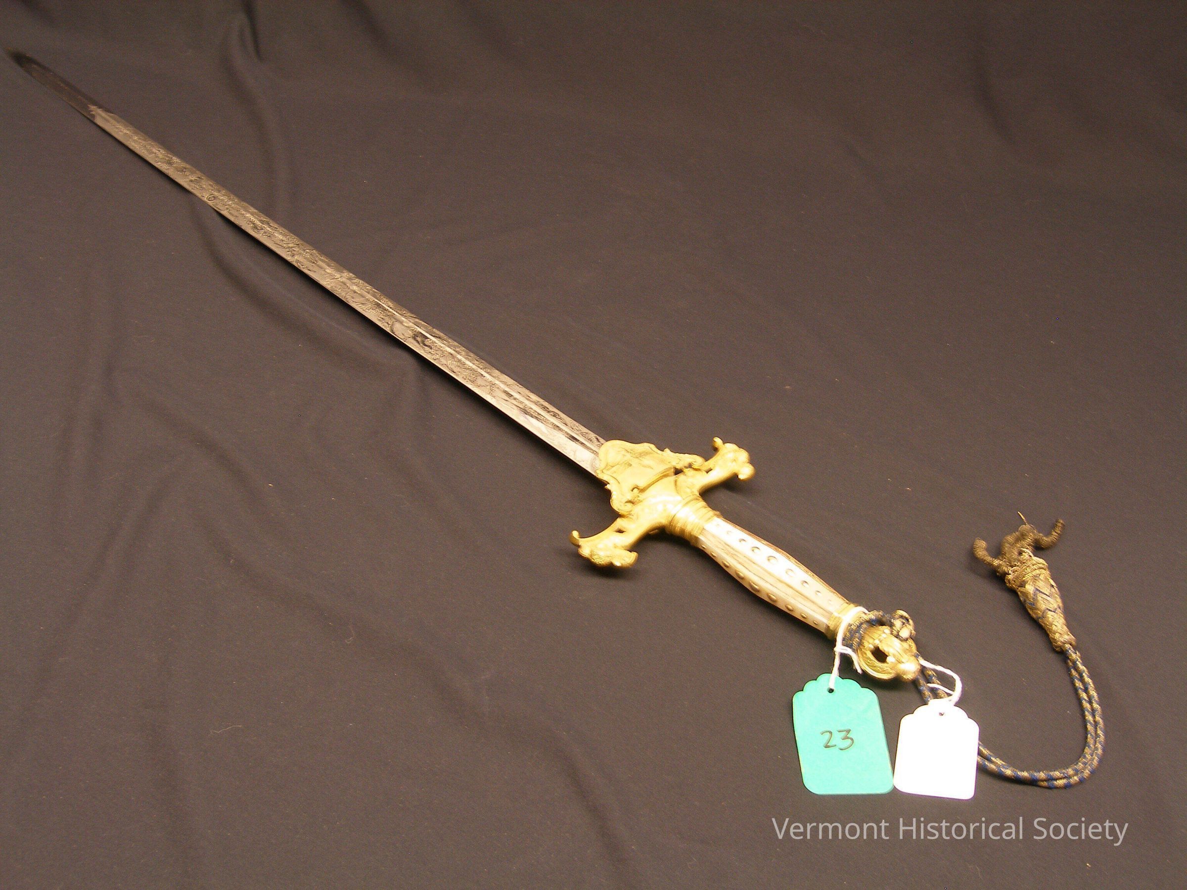 Presentation sword with the engraving, "Vermont to her Son, Horace B. Sawyer, U.S. Navy, Consitution, Cyane, and Levant, 20th Feb. 1815". The handle is gold and mother-of-pearl. The Vermont state seal is attached at the center of the rain guard. The blade of the sword is engraved throughout in a floral pattern. The gold scabbard is also engraved throughout with a scabbard.Context