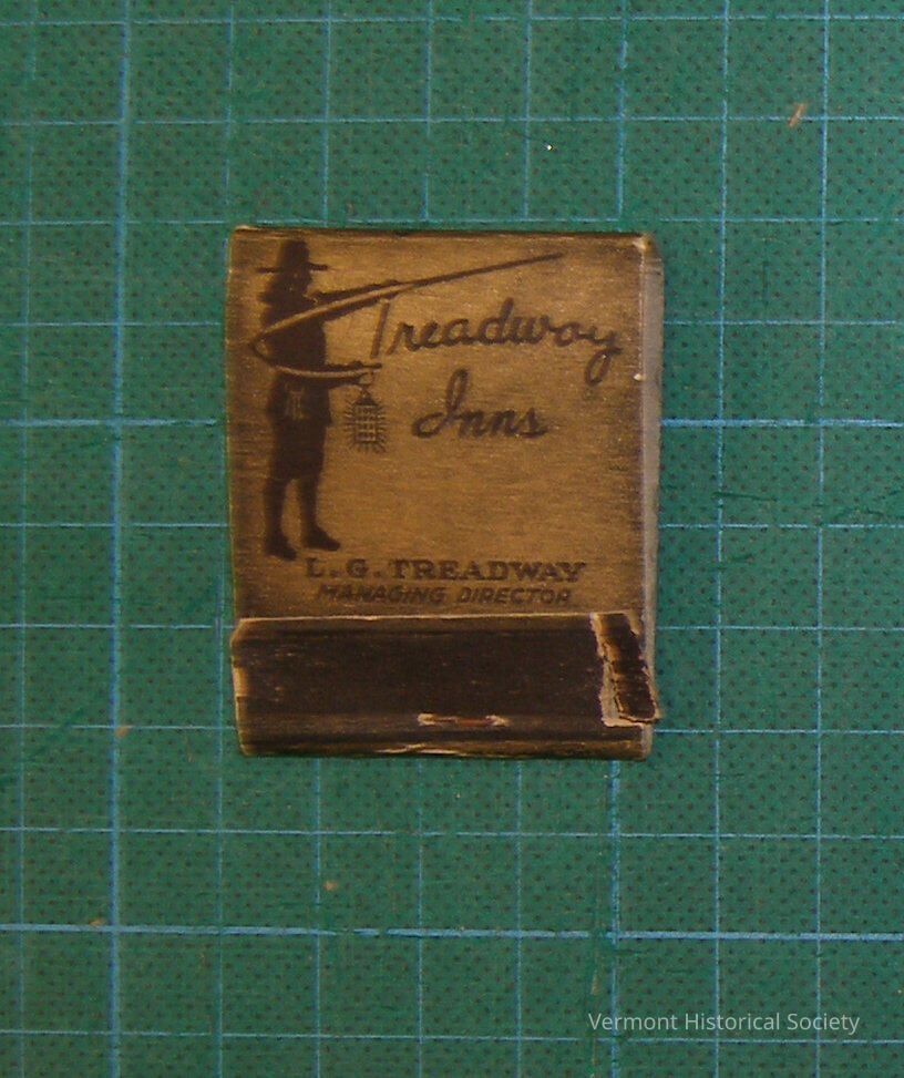 Matchbook, gold and black. Printed on front, "Treadway Inns/ L. G. Treadway, Managing Director" with a Revolutionary War figure holding a lantern. Printed on back, "Centuries/ of service to/ the public/ are behind/ their traditional/ comforts" Printed along fold at top, "Real/ New England Inns" Name of manufacturer along bottom edge is illegible. Listed inside cover are the eleven Treadway Inns in Vermont, Massachusetts and New York.Context