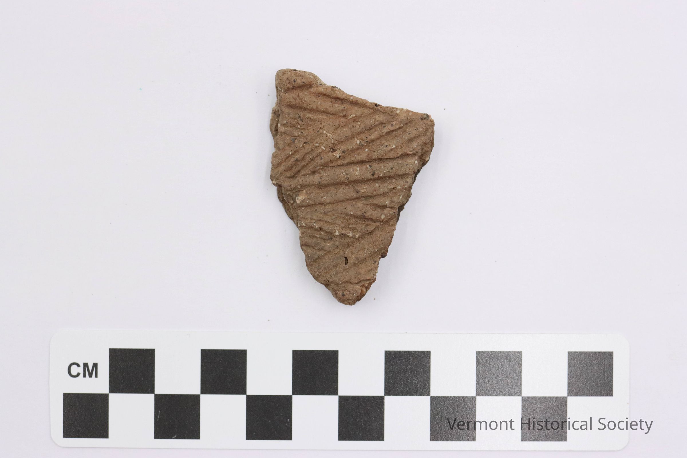Pottery rim sherd decorated with chevron patterns of dragged stamps separated by parallel rows of dragged stamps.