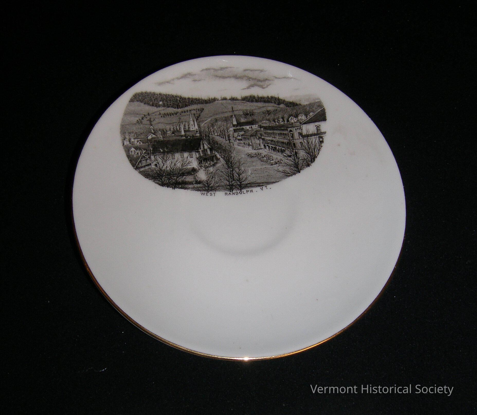 White ceramic demitasse saucer printed with an illustration of a town street lined with buildings. The image is labeled, "WEST RANDOLPH, VT." The bottom is marked, "Made in England W. E. Lamson West Randolph Vt."