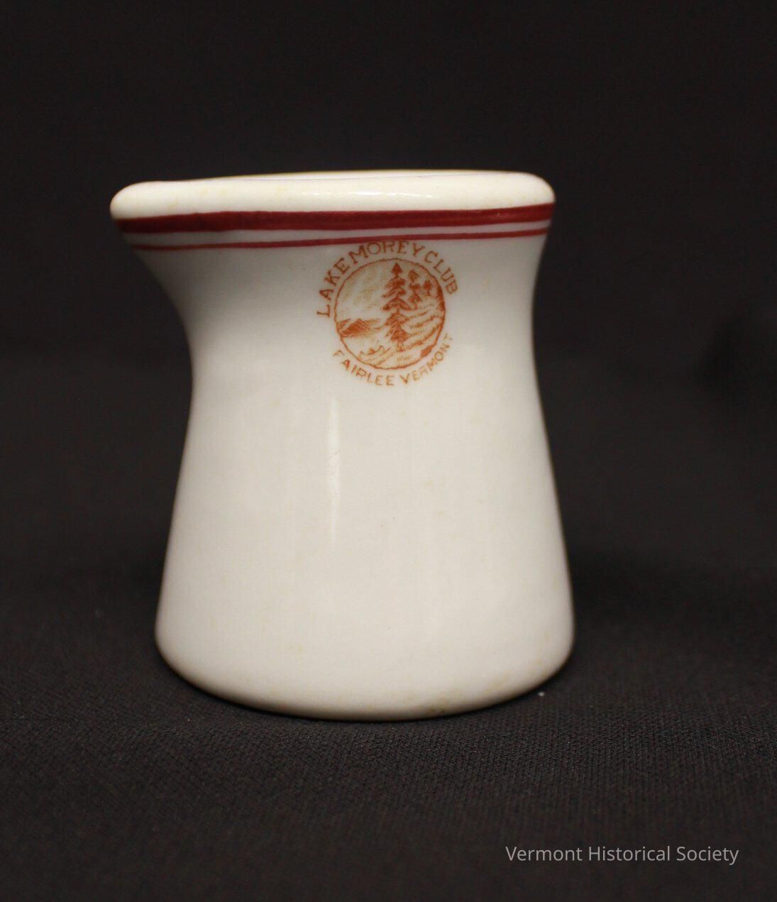 Heavy white ceramic cream (or syrup) pitcher with red striping around the top edge. Just below the striping is the logo of the Lake Morey Club, which consists of a small, circular lake scene with tall evergreens and the inscription, "LAKE MOREY CLUB FAIRLEE VERMONT".