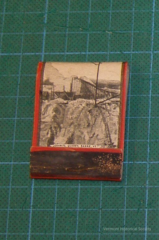 Matchbook printed with a black and white image with red border of a granite quarry and printed at bottom, "Granite Quarry, Barre, Vt." On back, at top, "Souvenir/ Granite Quarry, Barre, Vermont" and information relating to quarrying in Barre and Vermont. Matches have been removed.Context