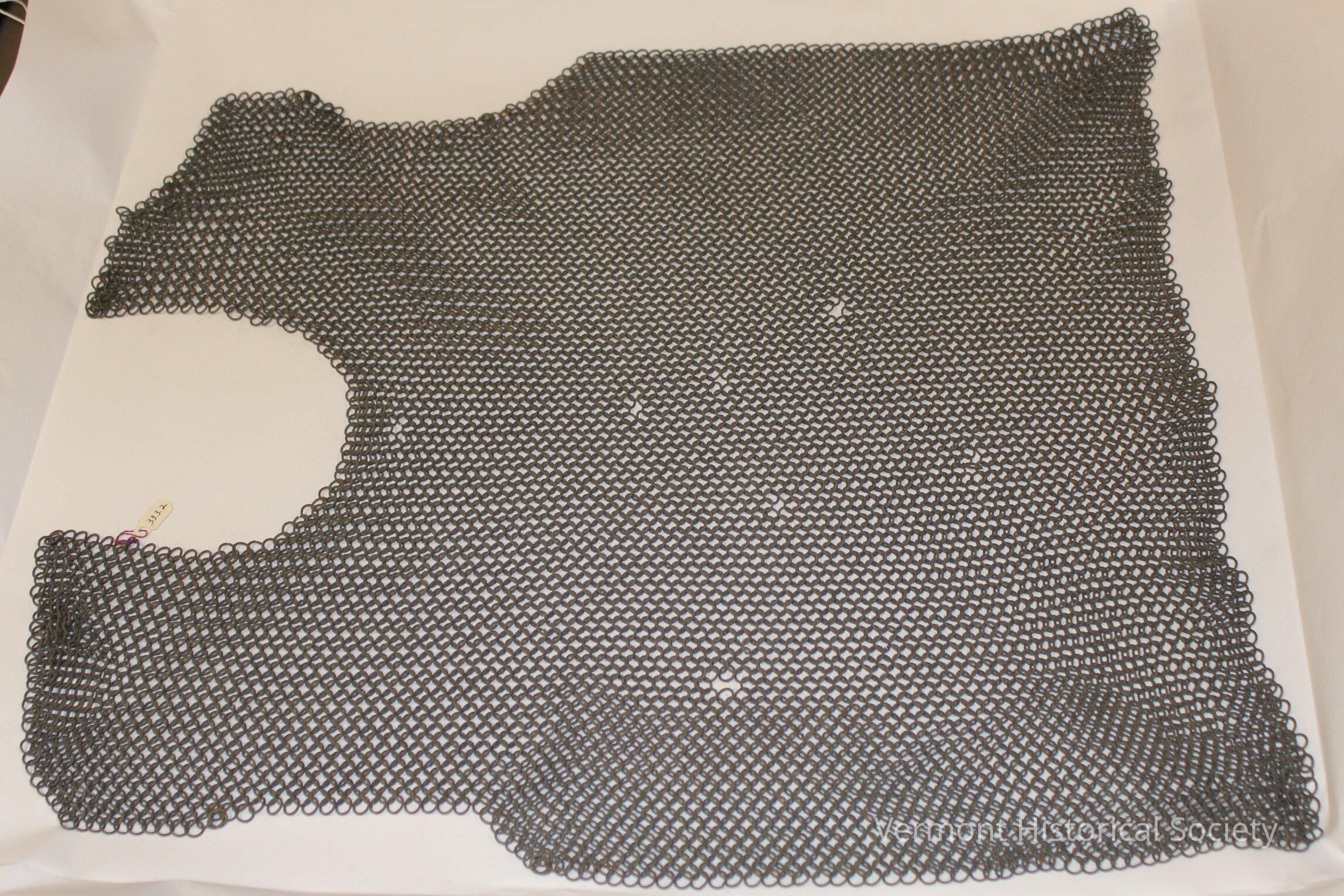 Chain mail shirt front. The mail is made of several round metal loops hooked together. It has a round collar and no sleeves. It originally had a back of cotton canvas, now missing.Use