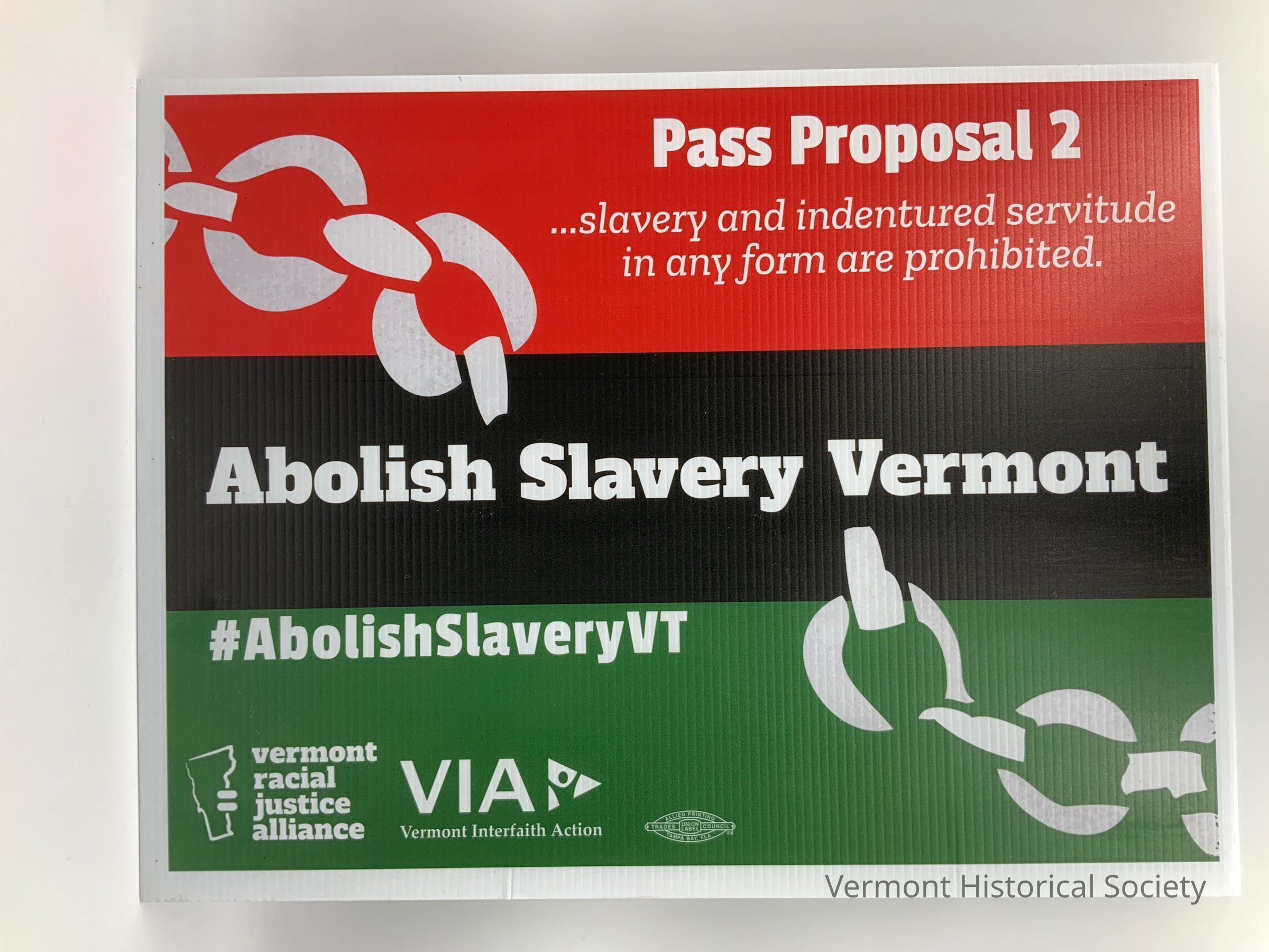 A red, black, and green yard sign. White drawings of chains start in the upper left and lower right corners and continue until the primary message text starts. The sign reads, "Pass Proposal 2 ...slavery and indentured servitude in any form are prohibited. Abolish Slavery Vermont #AbolishSlaveryVT," in white text. The Vermont Racial Justice Alliance and Vermont Interfaith Action logos are printed in white in the bottom left corner. The sign is double-sided and has the same message printed on both sides.Context