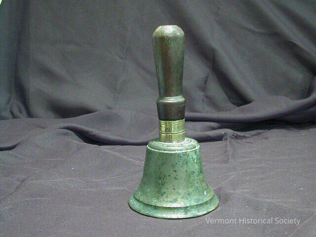 Hand bell with wooden handle. The bell has a metal skirt and clapper. The turned wooden handle is attached to the skirt with a brass ring.