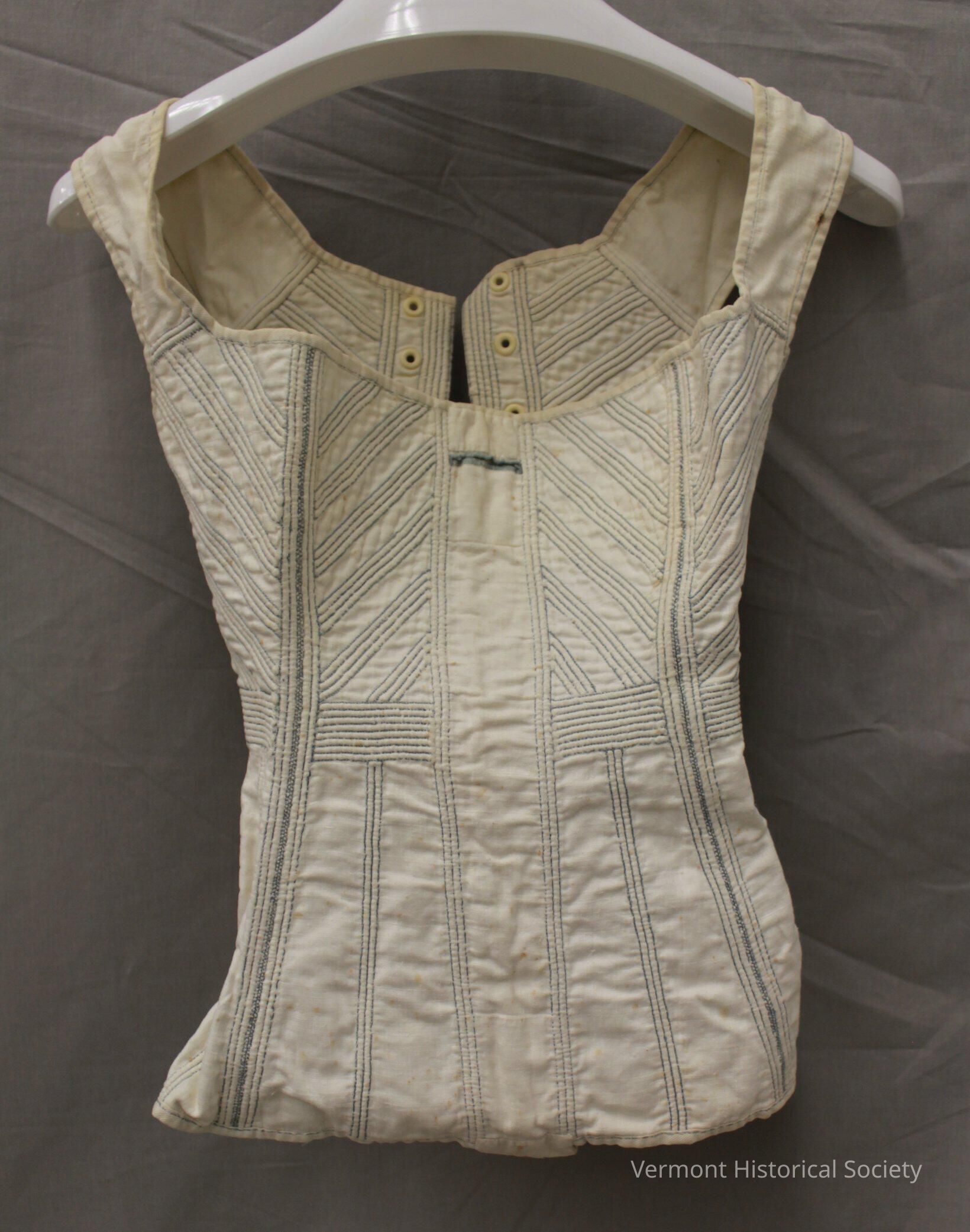 Corded stays, or jumps. It is corded along the seams, and diagonally at the breast and upper back. There is a vertical channel at the center front for inserting a busk. There are 12 bone eyelets on each side of the center back opening. The quilting stitches are done in black thread.