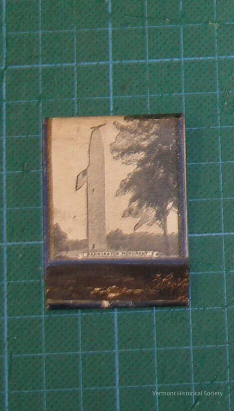 Matchbook with black and white image of "BENNINGTON MONUMENT" on cover and printed on back: "Souvenir/ Bennington Monument/ Bennington, Vermont" with a description of monument and historical information. Matches have been removed.Context