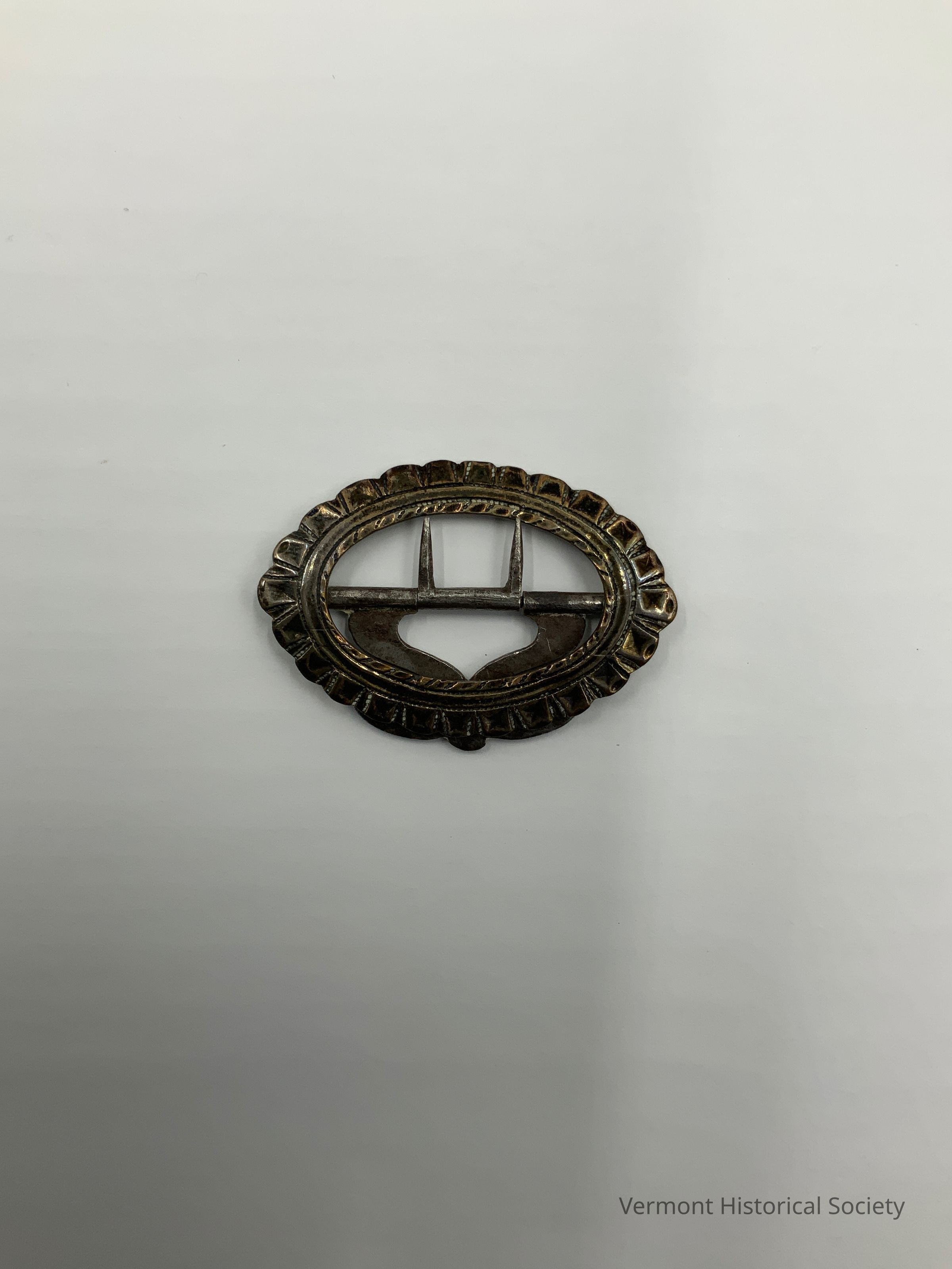 Silver-plated brass knee buckle. The buckle is oval with a center bar. The bar has two prongs and a hinged loop. The frame is petaled.