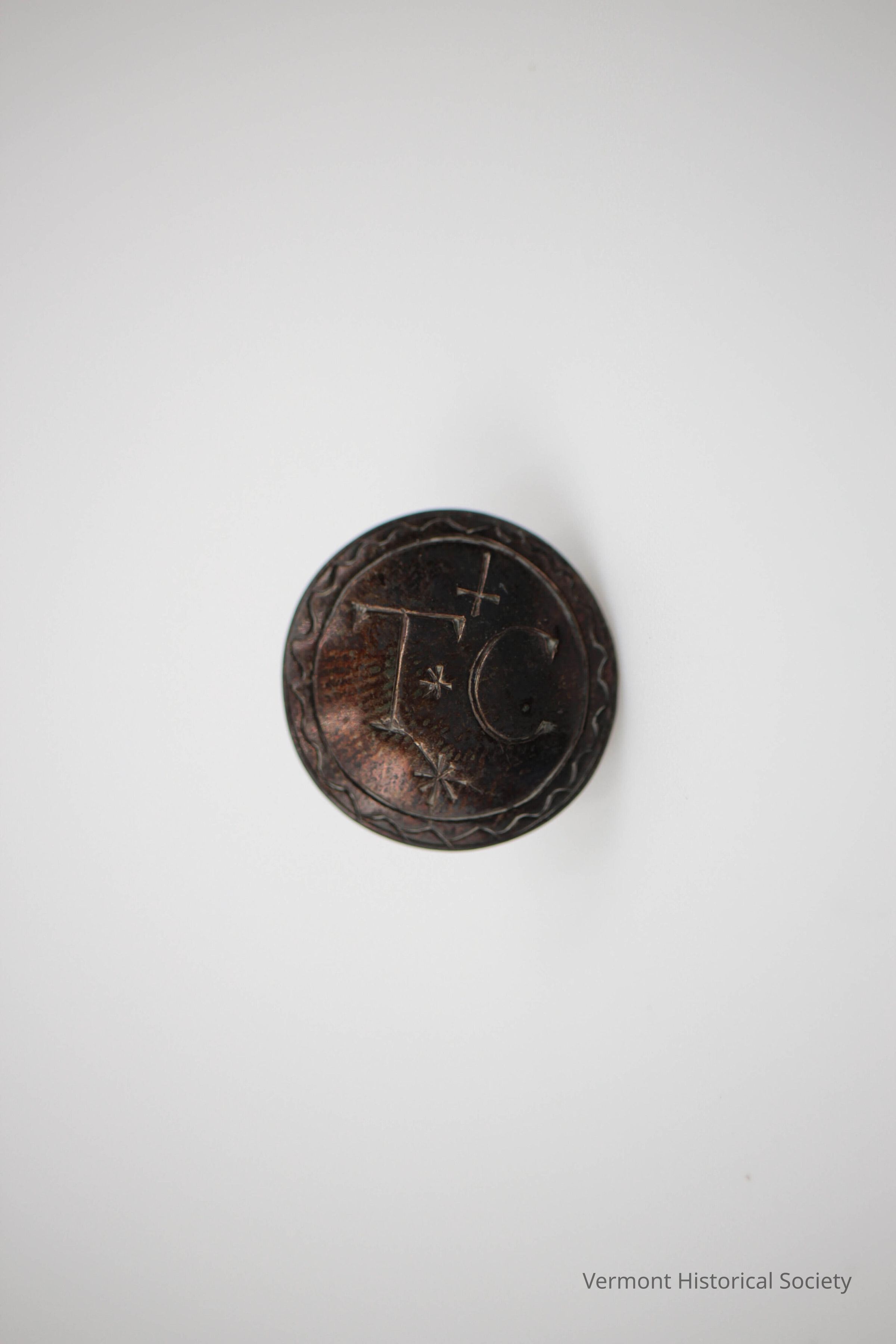 10 round, post-backed buttons. The buttons are engraved with a curvilinear line around the edge, and the initials TC in the center. The center is also engraved with three stars, or asterisks.