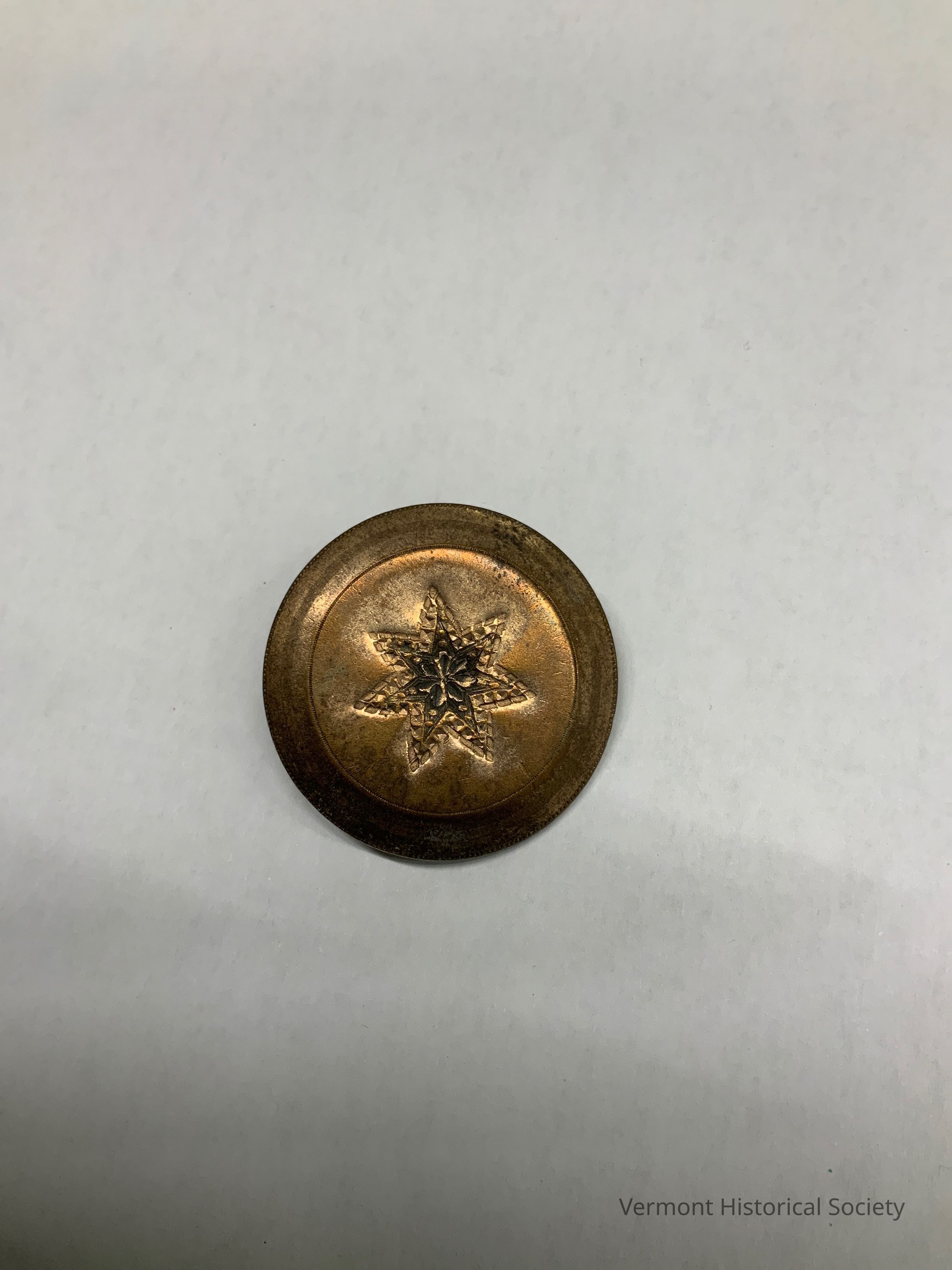 23 brass coat buttons. Each button is circular with a post back at the center. The front of each is stamped with a faceted 7-pointed star.
