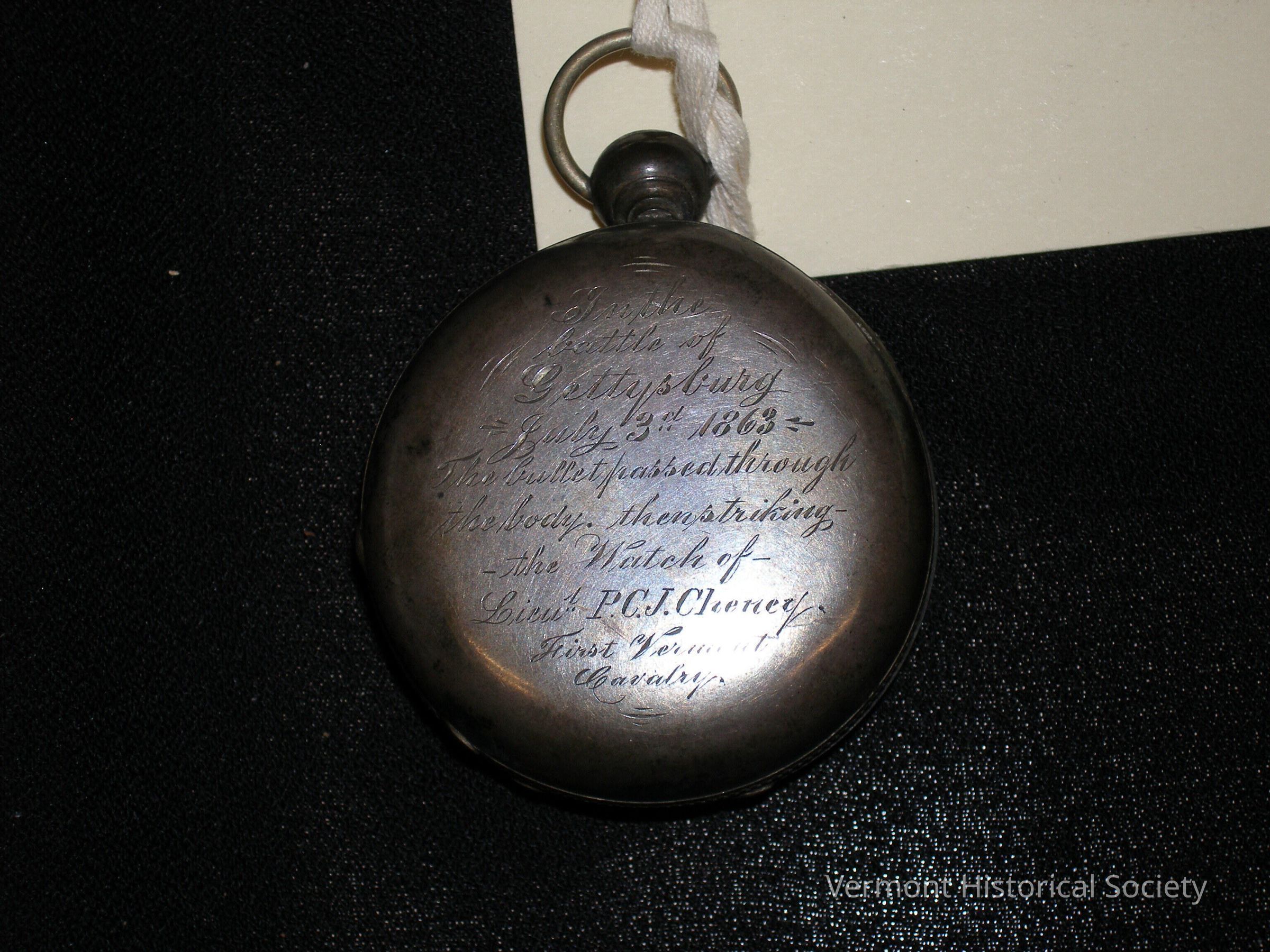Silver pocket watch. The front of the case, which is dented, is engraved with a small shield shape with a blank interior. The back of the case is engraved with the inscription, "In the battle of Gettysburg July 3d 1863 The bullet passed through the body then striking the Watch of Lieut. P.C.J. Cheney First Vermont Cavalry." The case opens to show a mostly shattered white enamel face with only the number 7-11 (in Roman numerals) still remaining.Context