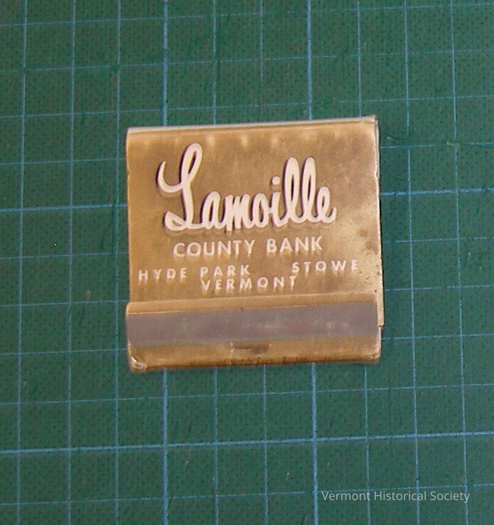 Matchbook, gold with white lettering. On front cover, "LAMOILLE/ COUNTY BANK/ Hyde Park Stowe/ Vermont" On back cover, "Celebrating/ 75 (1889-1964)/ Years of Progress/ Service and Growth" Printed on top fold, "MEMBER F.D.I.C." Printed inside cover is a list of bank services. Printed along bottom edge, "Universal Match Corp., Boston"Context
