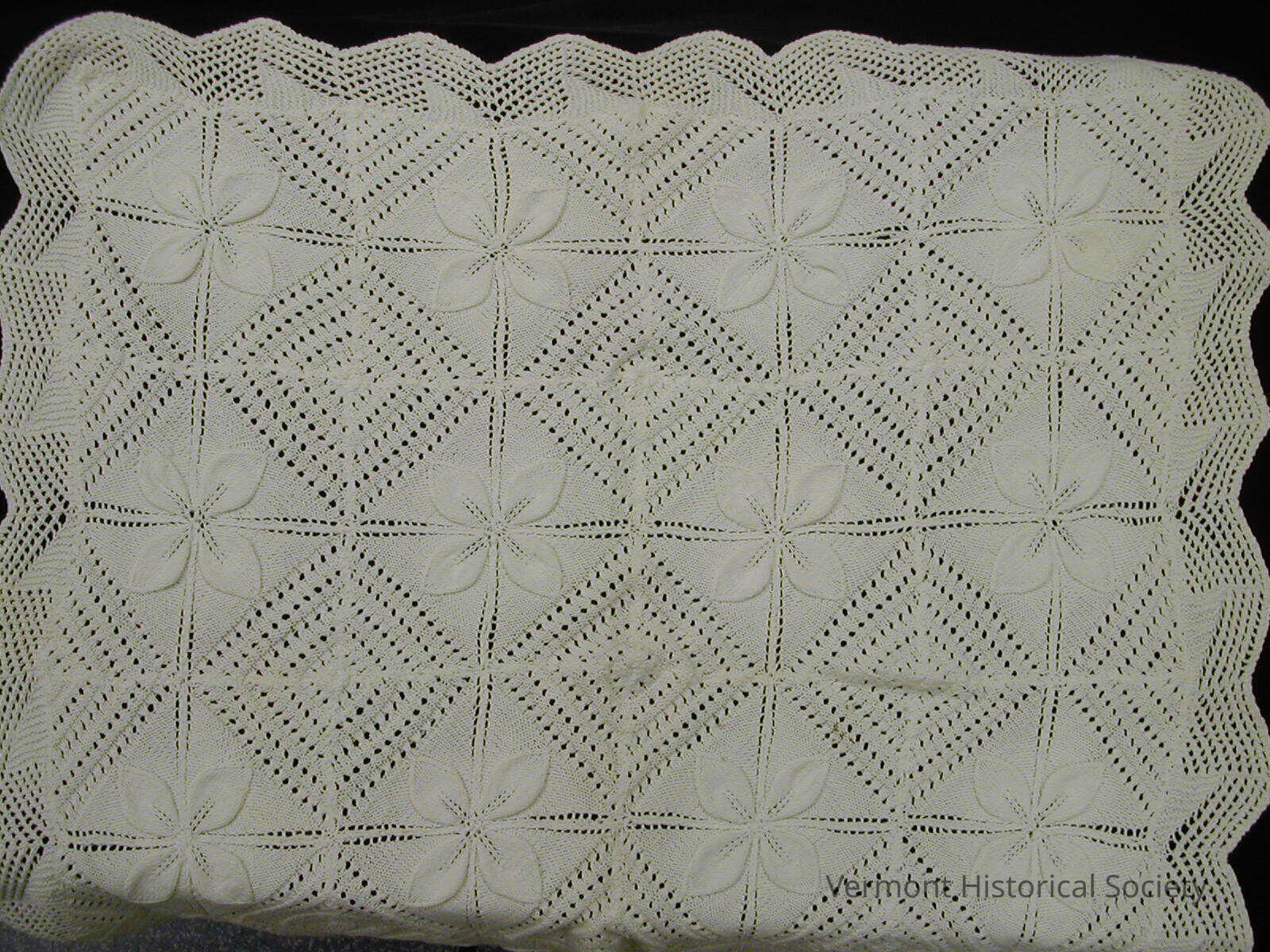 White knitted tablecloth for a side table. It is knitted in a pattern that alternates between openwork diamonds and slightly raised four-petaled leaves.