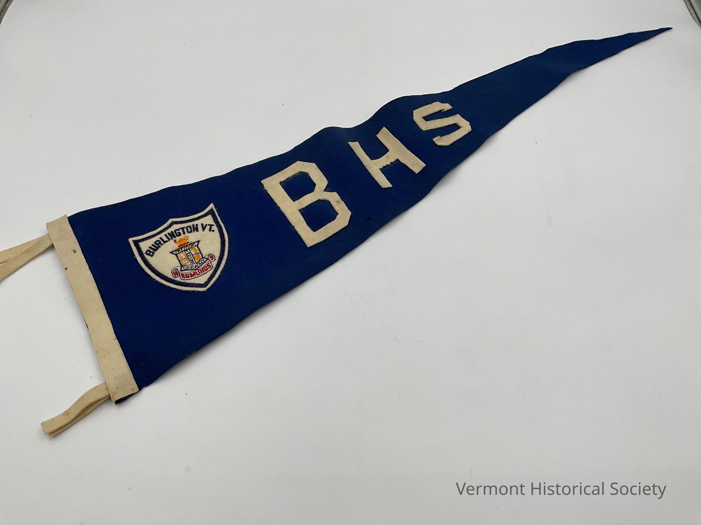 A blue pennant with large, white initials -- BHS -- glued on the pennant plus a shield logo for Burlington, Vermont. BHS stands for Burlington High School.