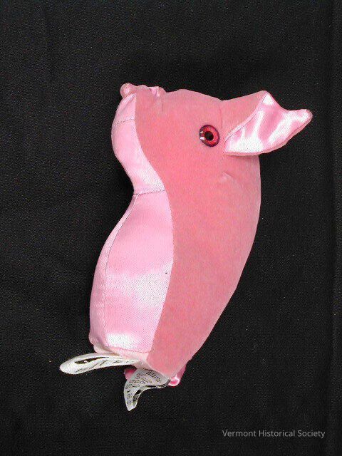 Stuffed finger puppet in the shape of a pig. The puppet has a velvet back and satin inner ears and stomach. Its nose is upturned with a gather at the top. It has plastic pink eyes. There is a hole at the base for inserting a finger.