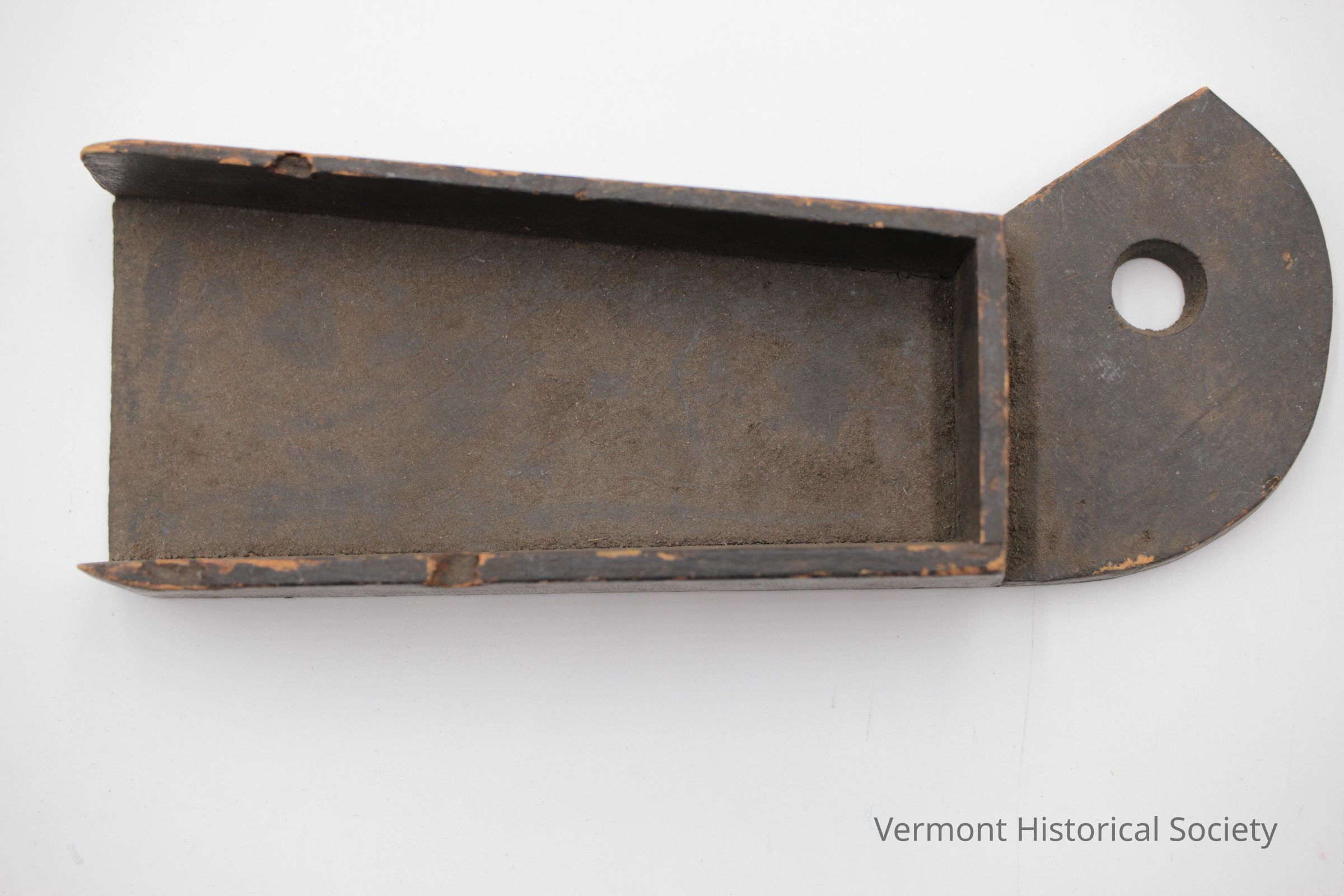 Wooden pattern consisting of a flared rectangular box with a wedge-shaped handle.