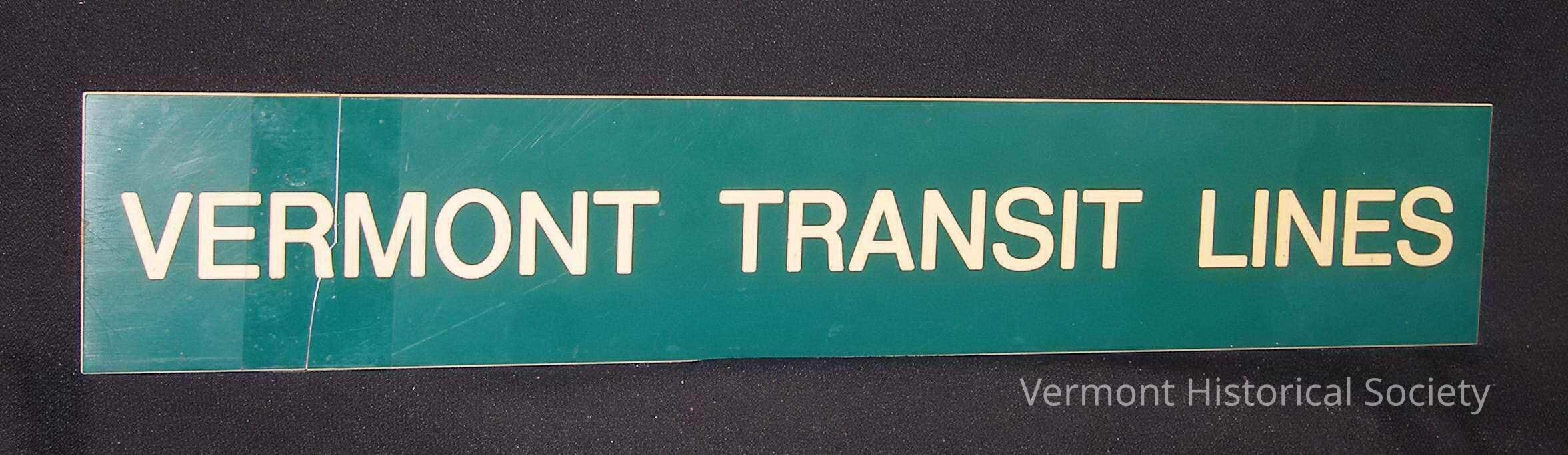 Plastic (mended) Vermont Transit door sign. White plastic with green laminate top. Lettering cut out to appear white. The piece has been taped to a surface so there is a 2" wide strip of tape residue on the back that goes almost the entire length of the piece.